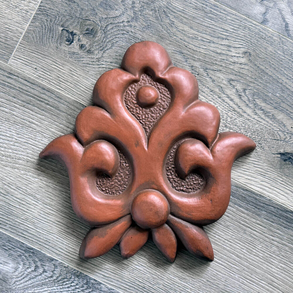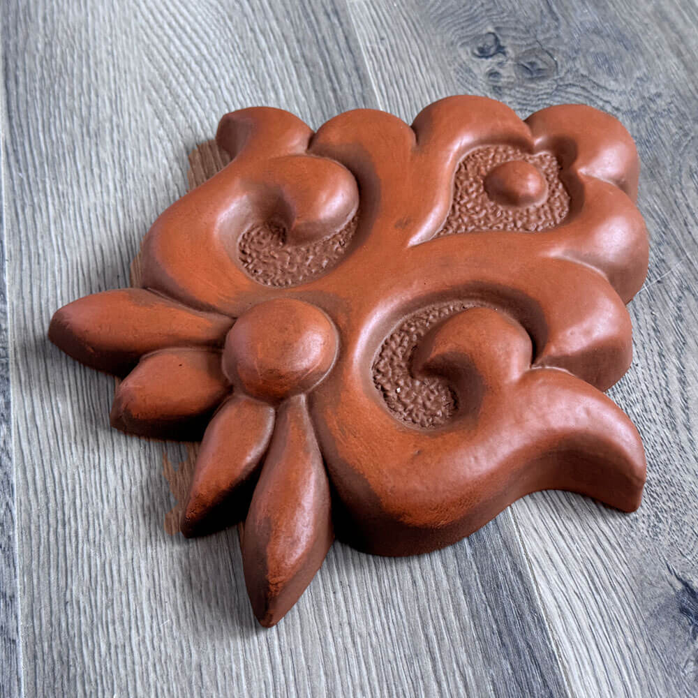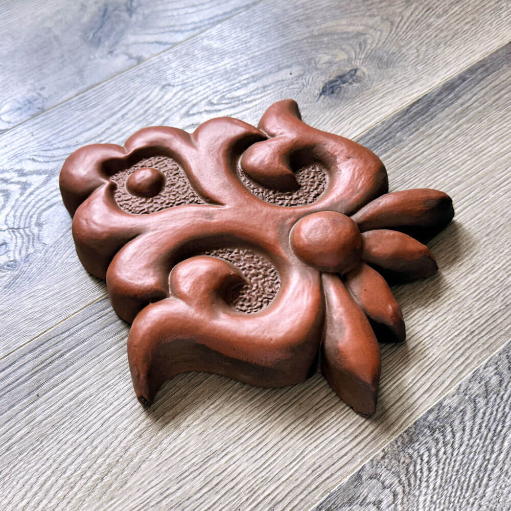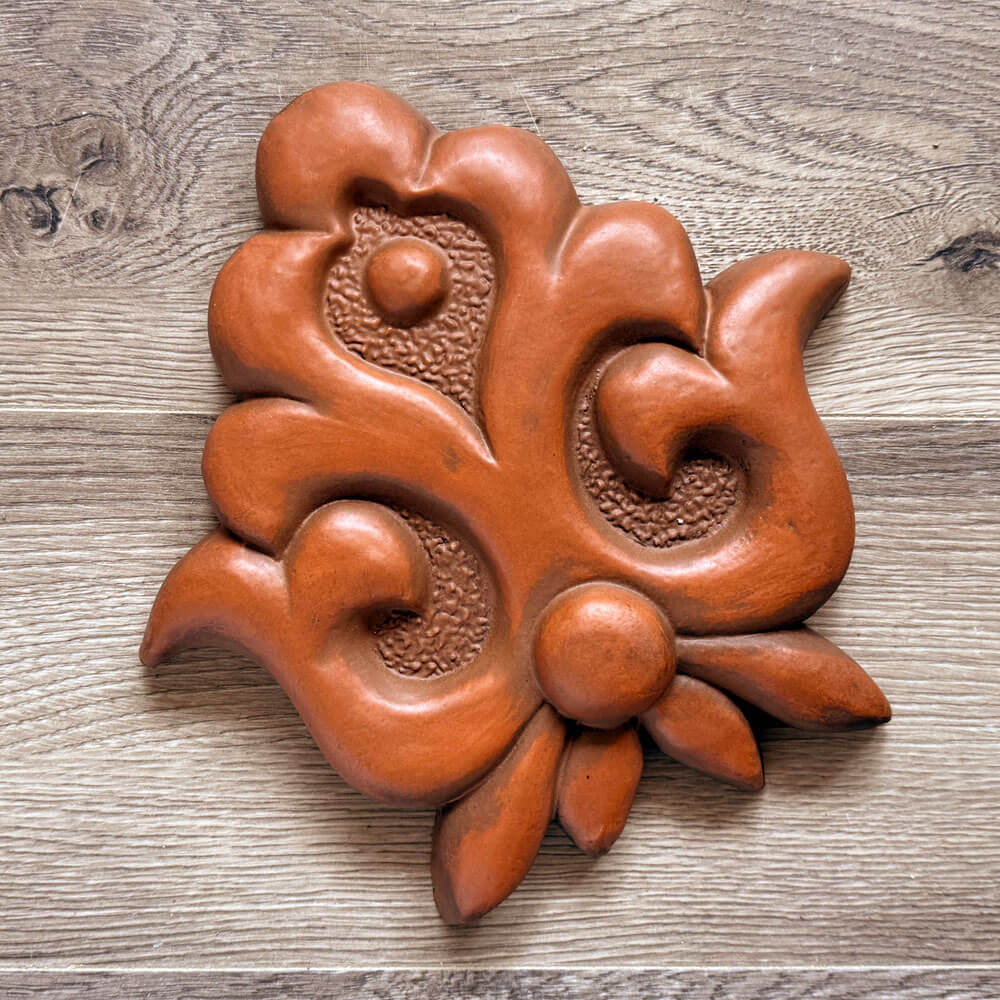 Decor ceramic, inspirat dintr-un decor de orfevrarie. Are dimensiunea de 22 x 22 cm si se poate comanda in mai multe culori, cu glazura lucioasa sau mata.