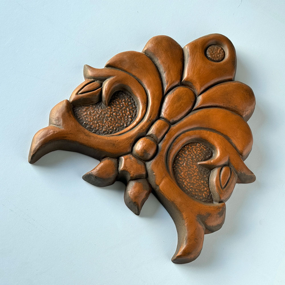 Decor ceramic, inspirat dintr-un decor de orfevrarie. Are dimensiunea de 31 x 29 cm si se poate comanda in mai multe culori, cu glazura lucioasa sau mata.