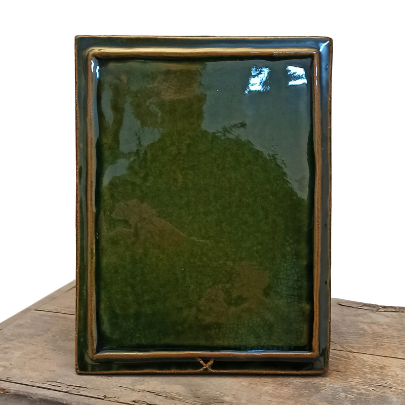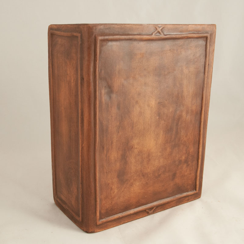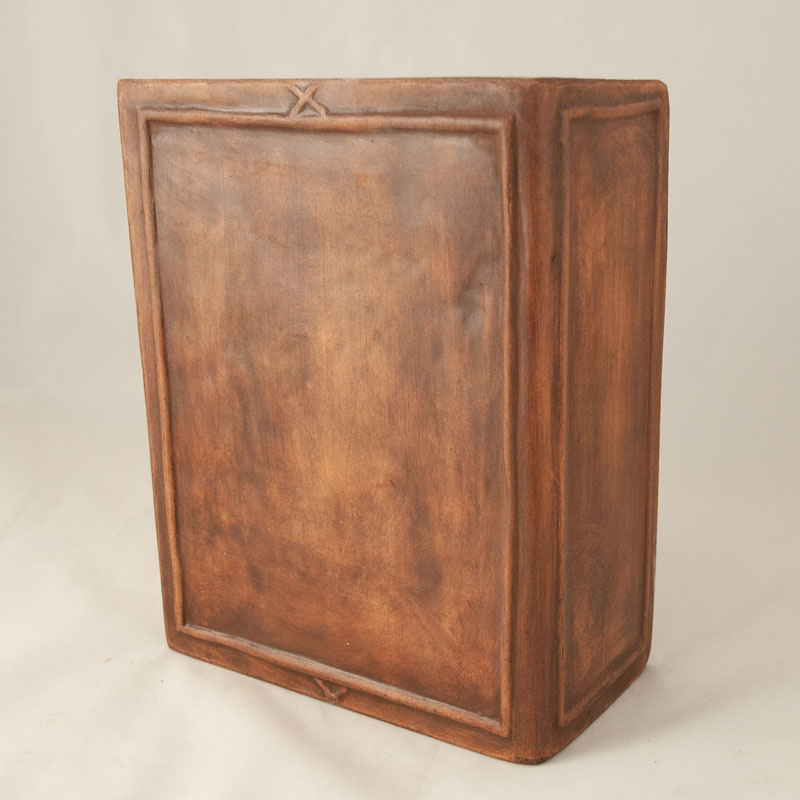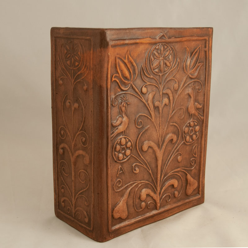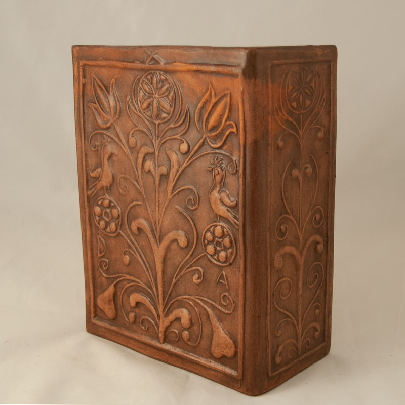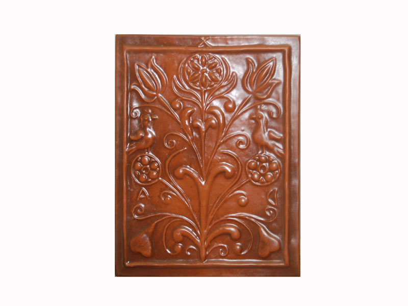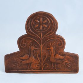Cahla de soba nesmaltuita, decor in relief cu motive ornamentale geometrice, fitomorfe, zoomorfe si florale. Piesa contine inscriptia D A, initialele mesterului olar. Secolul al XVIII – lea, Almasu Mare.