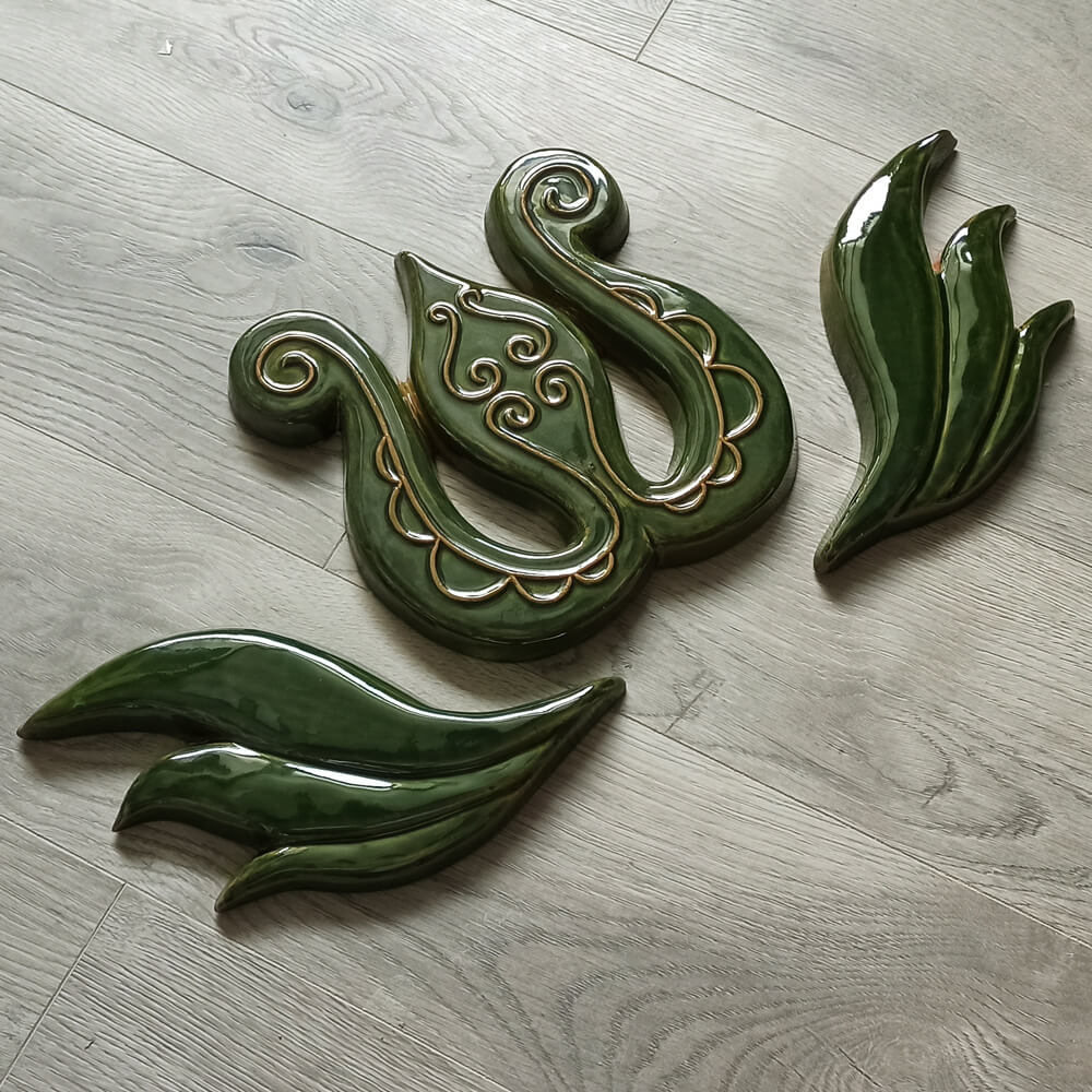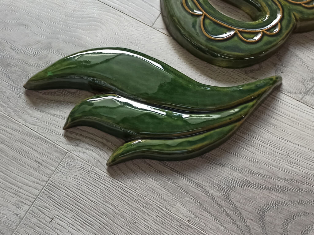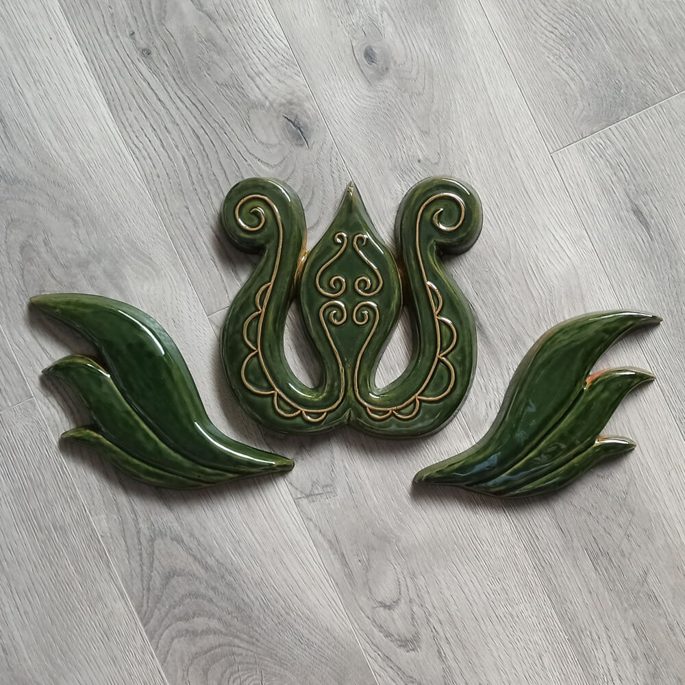 Set decor ceramica, compus din 3 piese, care se poate folosi in diferite moduri, ca decor semineu, decor central al sobelor zidite, dar si ca decor de perete. Pe suprafata semineelor sau sobelor se poate monta folosind un adeziv termorezistent cu priza rapida, de exemplu Haftmörtel sau Stovefix Ofenbaukleber.