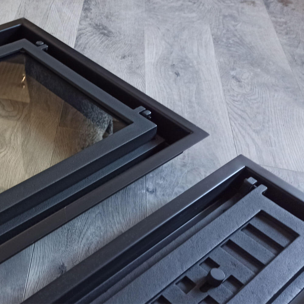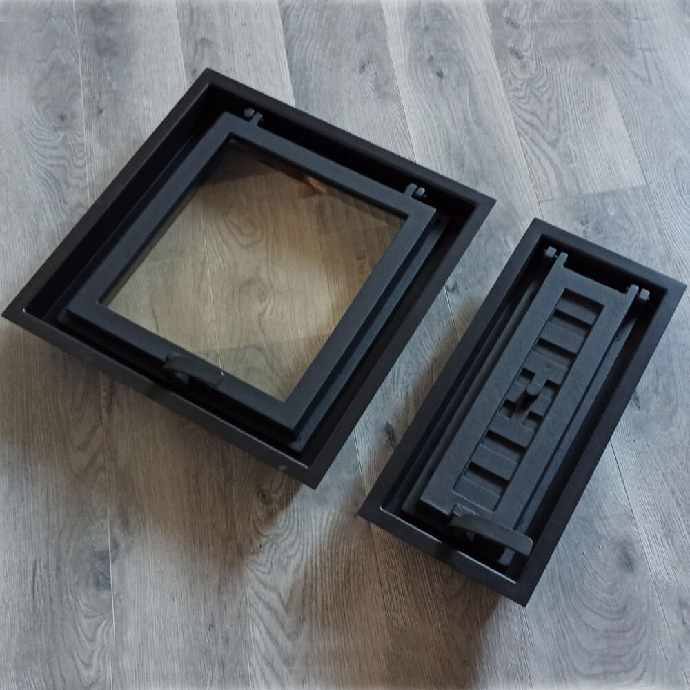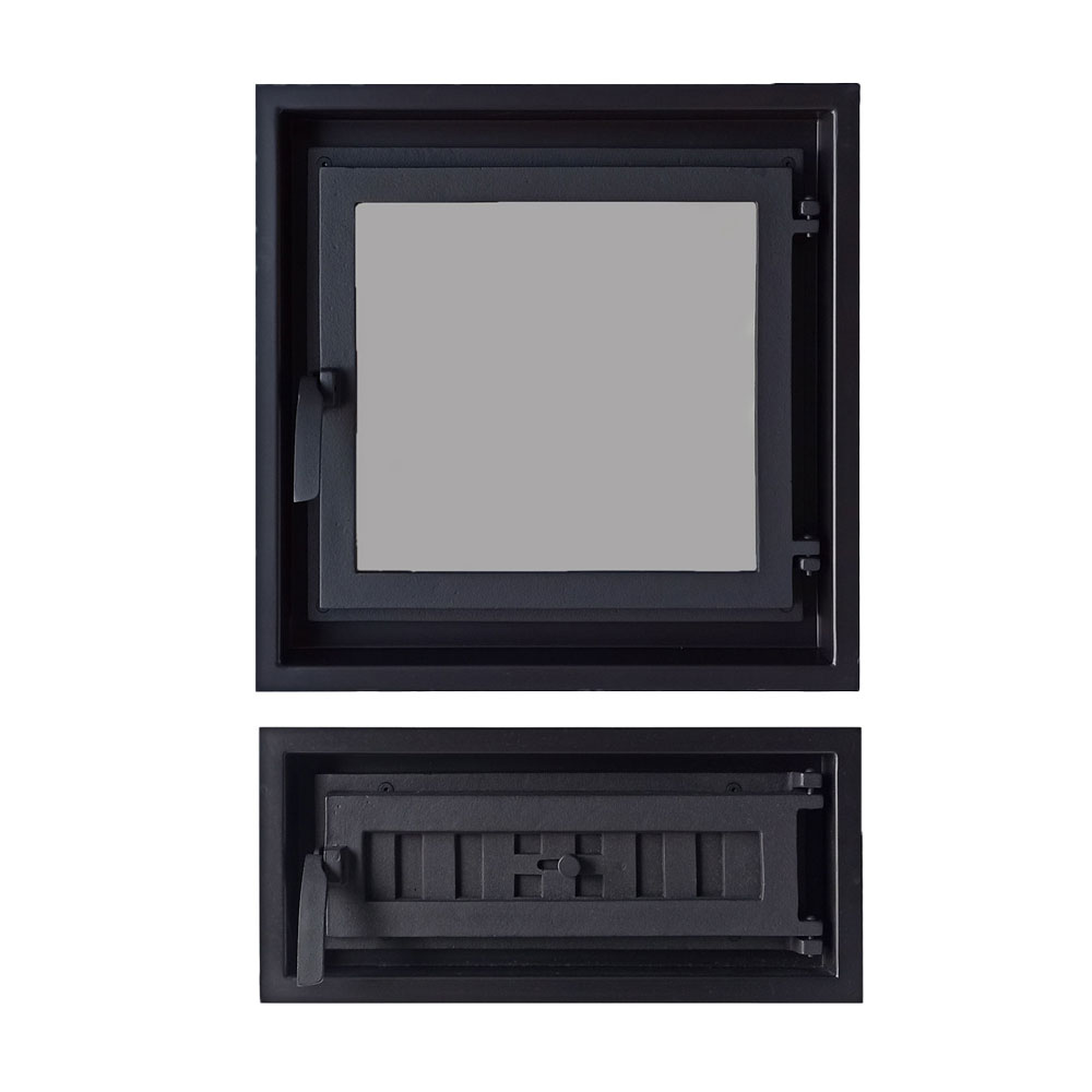 Usa de soba realizata in stil minimal, design simplu care se potriveste la sobele de teracota realizate in stiluri arhitecturale variate. Usa este realizata din fonta de calitate superioara, prevazuta cu rama de acoperire din otel si cu snur de etansare la inchidere si la sistemul de prindere al geamului. Si usa de cenusar din fonta.