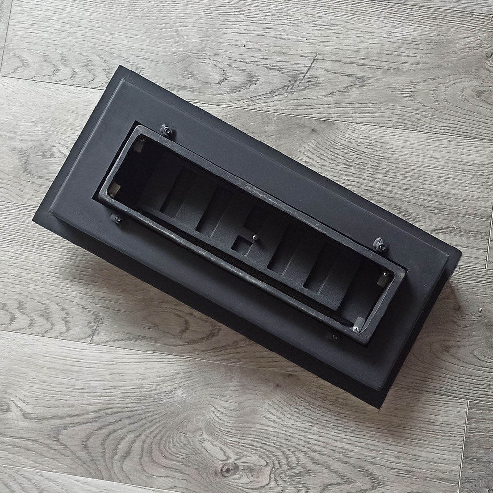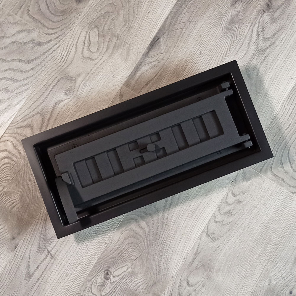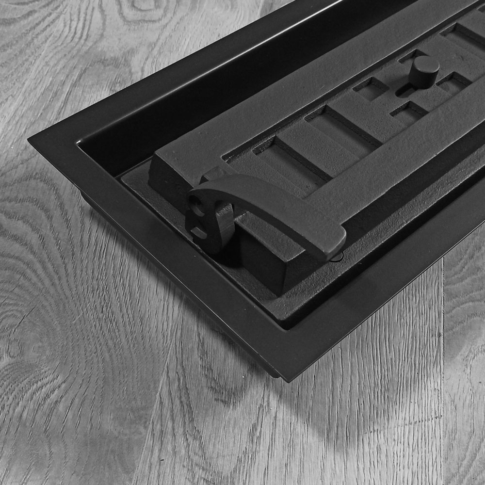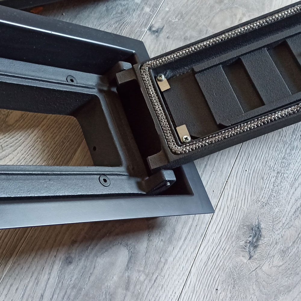 Usa de cenusar realizata in stil modern, cu un design simplu, dar cu caracter. Aceasta usa este compusa din doua parti, are o usa din fonta de o calitate superioara, care este montata pe o rama metalica. Usa are inchidere etansa, fiind prevazuta cu snur de etansare la inchidere si la sistemul de prindere al geamului.