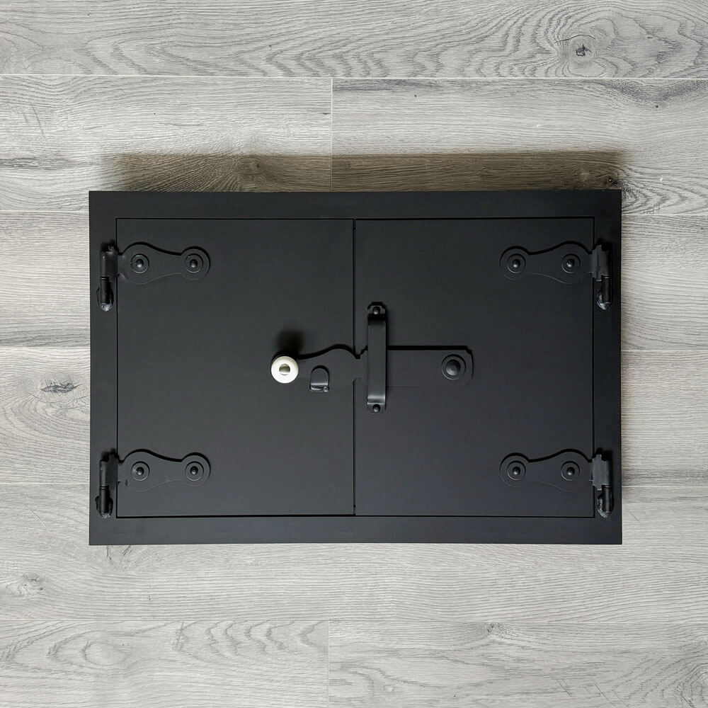 Usa de cuptor de copt paine sau pizza, realizata in stil rustic, design simplu care se potriveste la bucatariile de vara, exterioare. Usa este realizata din profile metalice de calitate superioara, prevazuta cu maner din ceramica glazurata in alb.