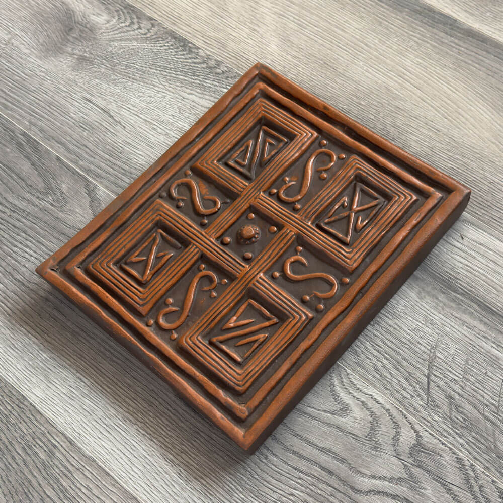 Cahla de soba dreptunghiulara, nesmaltuita, cu rame laterale. Decor in relief cu motive ornamentale geometrice si motive asemanatoare literelor S, X, Z. Secolul al XV-XVI-lea, Cadaciu Mare.