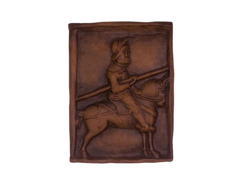 Cahla dreptunghiulara, nesmaltuita, reconstruita pe baza de fragmente. Compozitia piesei prezinta un cavaler in armura, calare. Secolul al XVI-XVII – lea, Cristuru Secuiesc.