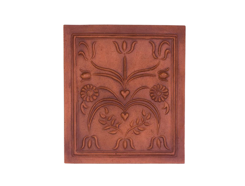 Cahla de soba cu rame laterale, nesmaltuita, decor in relief cu motive ornamentale florale, care se inalta dintr-o inima. Secolul al XVIII-lea, Targu Secuiesc.