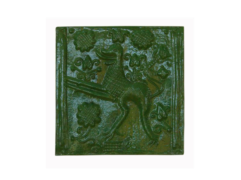 Cahla de soba dreptunghiulara, smaltuita in verde, avand ca ornament figura unui dragon. Secolul al XIX-lea, Odorheiu Secuiesc.