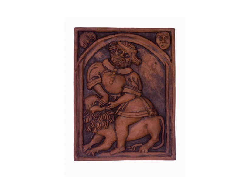 Cahla de soba dreptunghiulara, nesmaltuita, cu rama laterala. Este decorata cu scena biblica de lupta intre Samson si leul. Secolul al XVI-lea, Rugonesti.