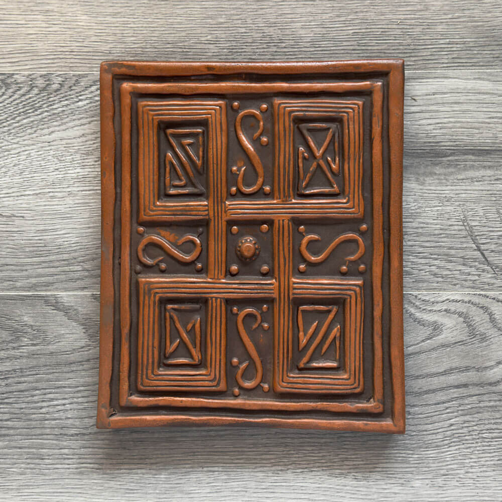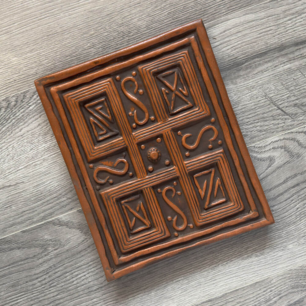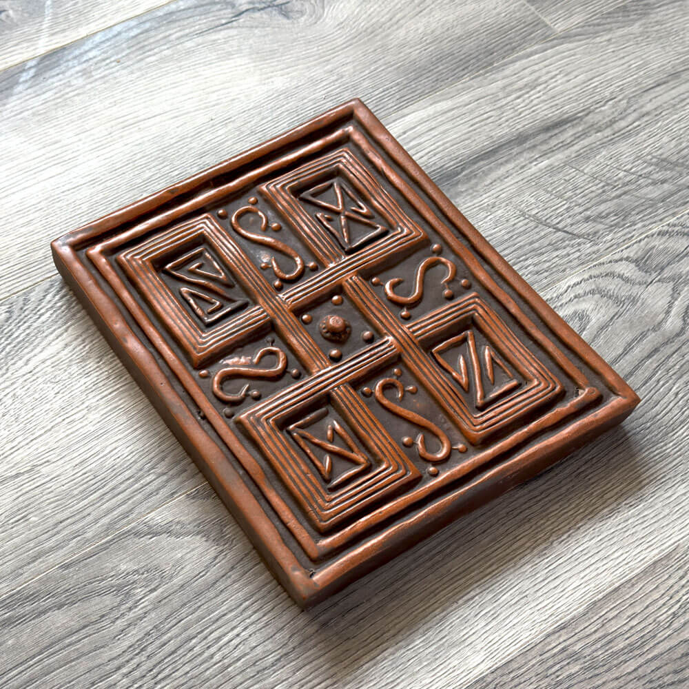 Cahla de soba dreptunghiulara, nesmaltuita, cu rame laterale. Decor in relief cu motive ornamentale geometrice si motive asemanatoare literelor S, X, Z. Secolul al XV-XVI-lea, Cadaciu Mare.