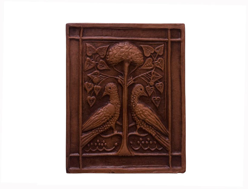 Cahla de soba rectangulara, nesmaltuita, decor in relief cu pomul vietii amplasat intre doua pasari. Secolul al XV – XVI-lea, Cristuru Secuiesc.