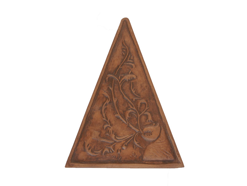 Reconstructie dupa o cahla cu forma atipica de triunghi, folosita de obicei la inchiderea structurii sobelor din evul mediu. Este decorata cu imaginea unui caine si decoruri fitomorfe.