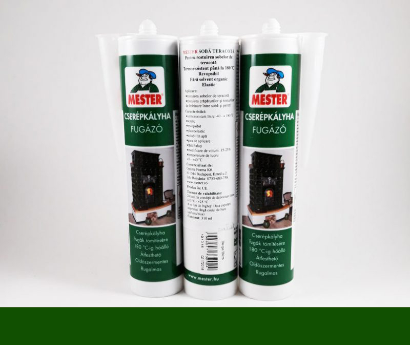 Chit de rosturi profesional, folosit la sobe de teracota dar si seminee, la umplerea rosturilor dintre placile de teracota. Este un chit soba teracota verde elastic si termorezistent, care rezista foarte bine la dilatarea si contractarea sobei de teracota, nu cade la scurt timp dupa constructia sobei. Datorita elasticitatii este foarte durabila. Se poate revopsi pentru o culoare care armonizeaza cu culoarea placilor de teracota.