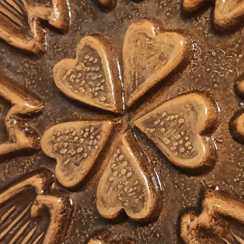 Decor ceramic rotund cu diametrul de 28 cm, inspirat din decorul cahlei de teracota K060. Decorul s-a realizat pentru a fi folosit ca si decorul central al unei sobe, realizat din placile de teracota de mai sus.