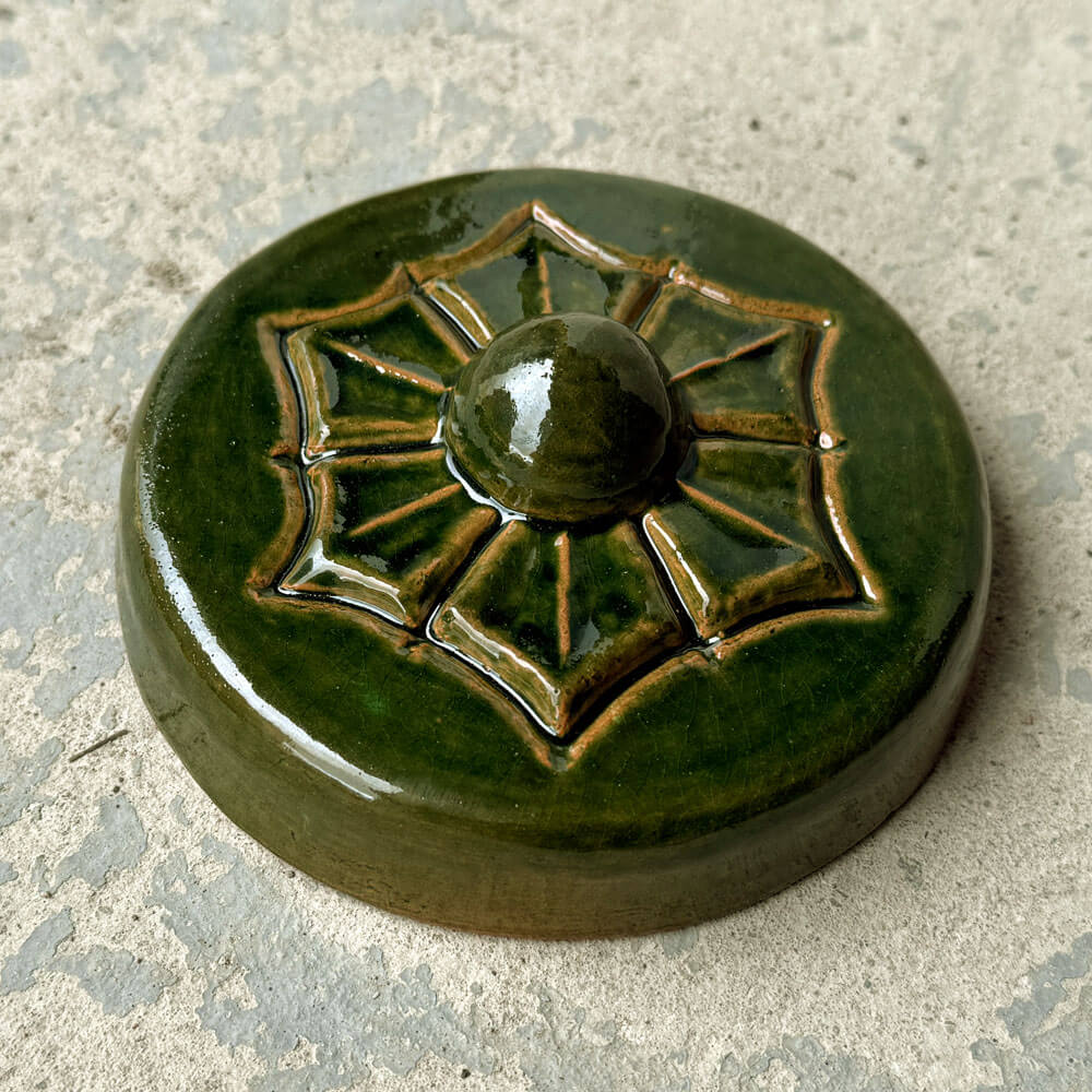 Decor ceramic, inspirat dintr-un decor de orfevrarie. Are diametrul de 12 cm si se poate comanda in mai multe culori, cu glazura lucioasa sau mata.