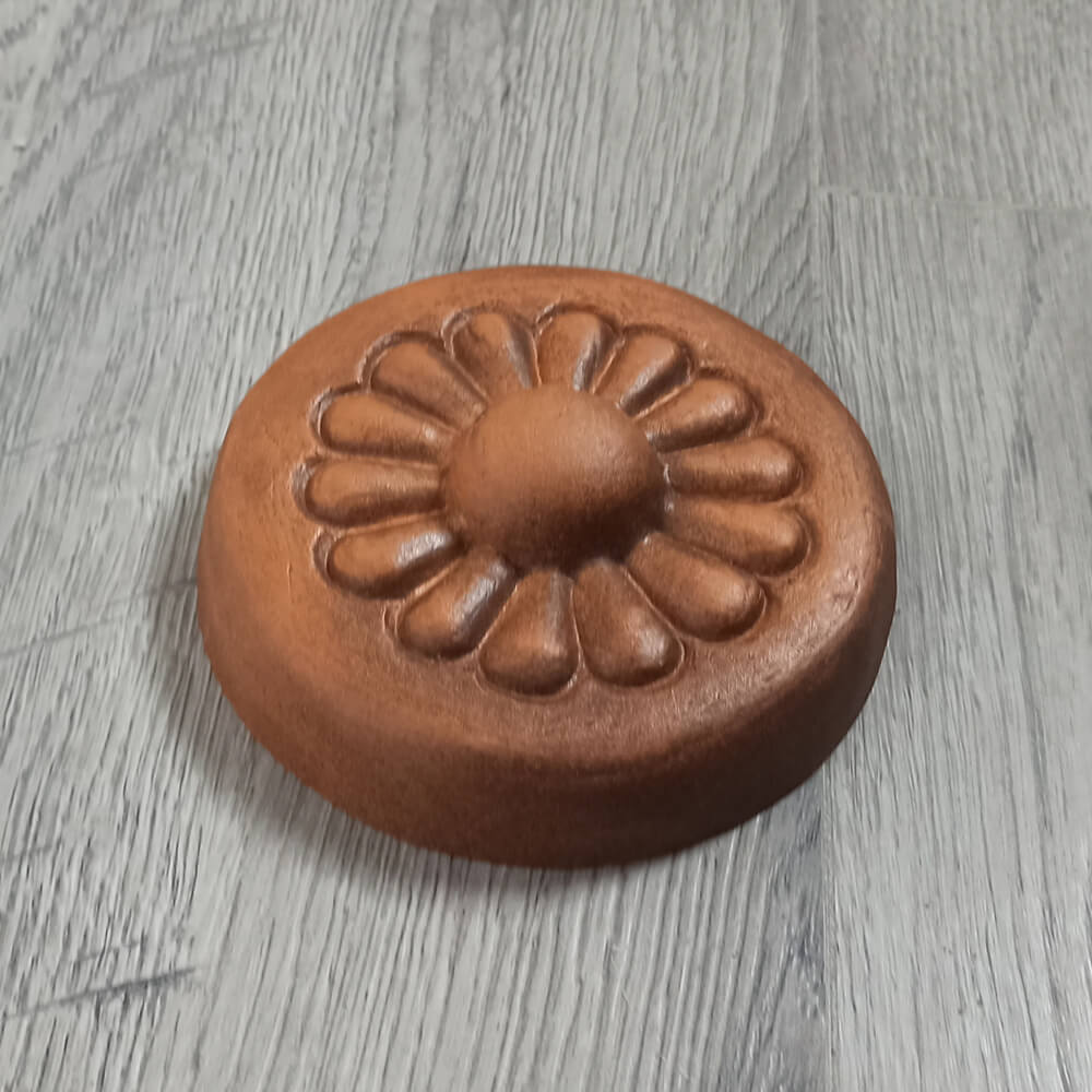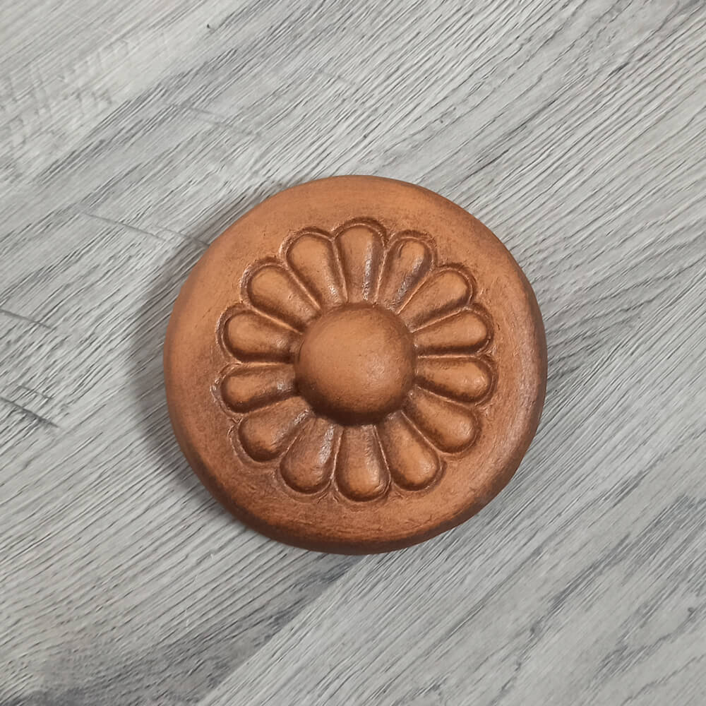 Decor ceramic, inspirat dintr-un decor de orfevrarie. Are diametrul de 12 cm si se poate comanda in mai multe culori, cu glazura lucioasa sau mata.
