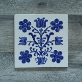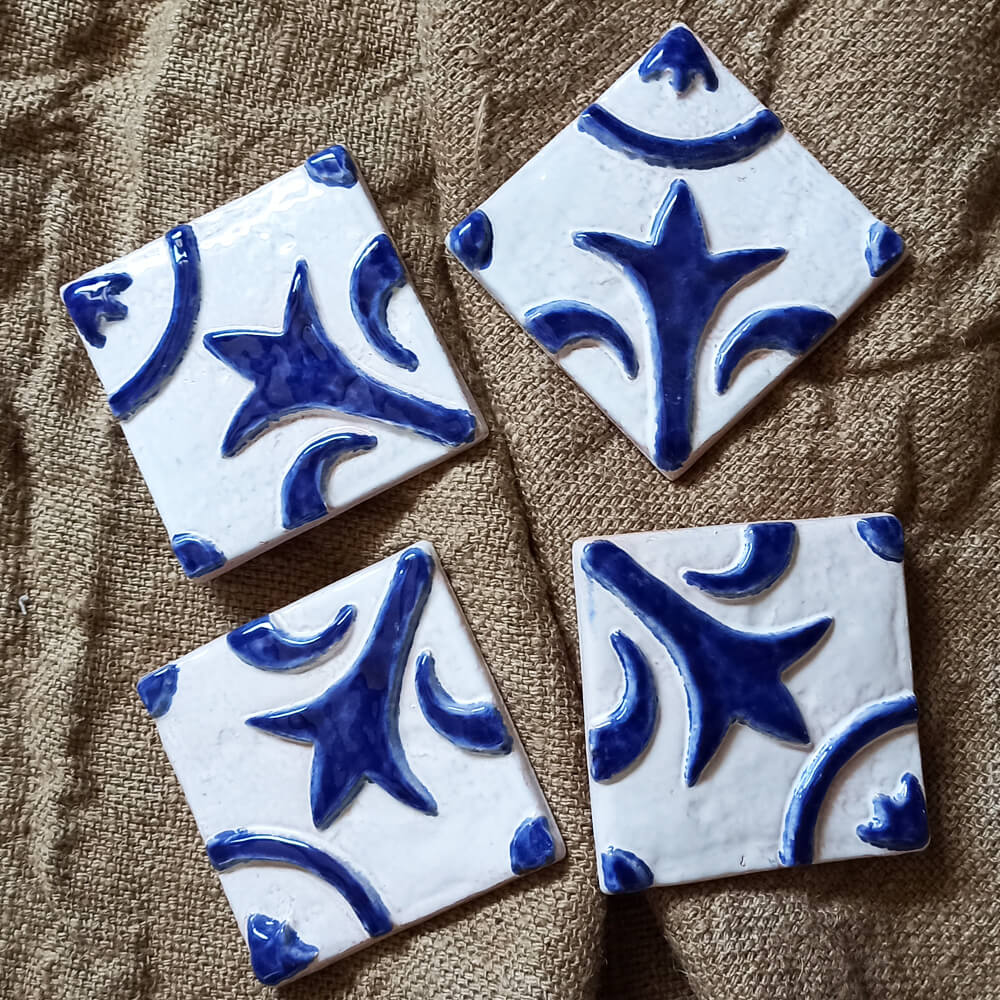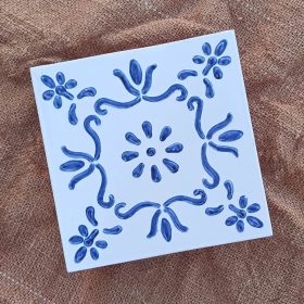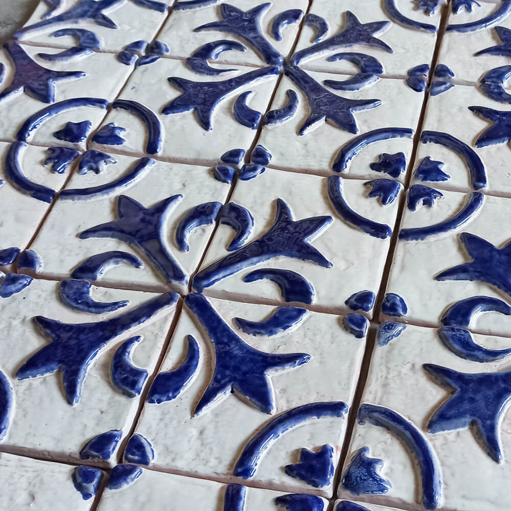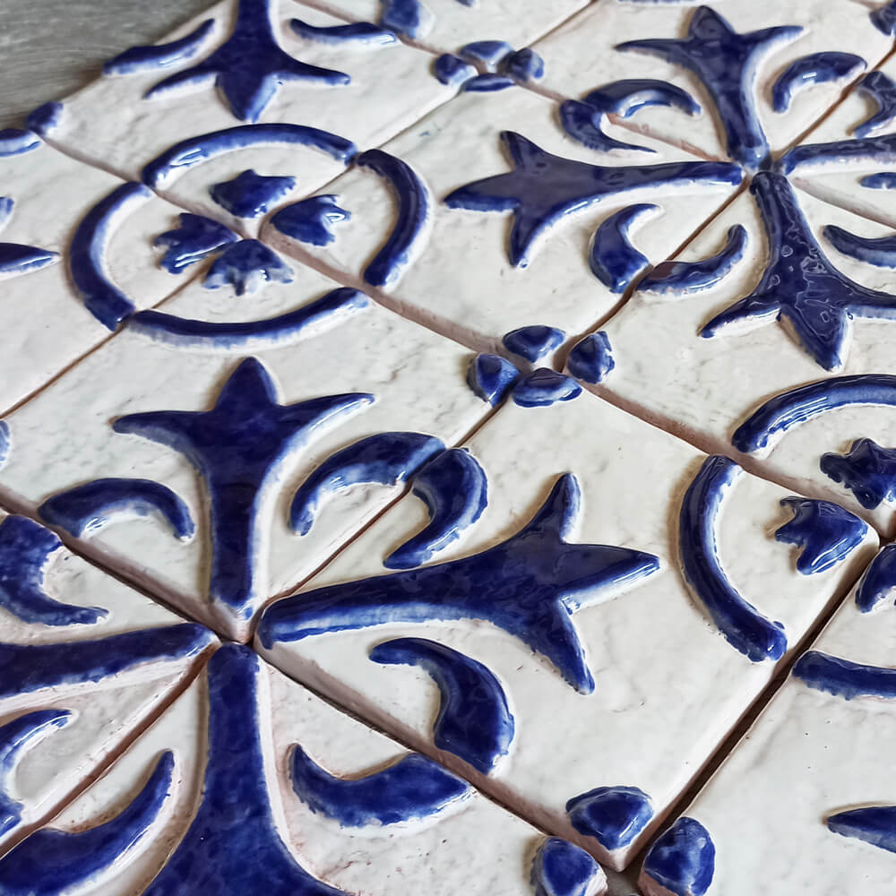 Faianță handmade, realizată prin presare manuală din argilă cu conținut de praf de șamotă. Aceste plăci sunt decorate cu model floral și geometric ieșit în relief. Modelul care iese în relief este pictat cu o culoare de accent. Cele mai des folosite culori în acest sens sunt culorile albastru, verde, maro, turcoaz, galben. Acest model este disponibil în 2 dimensiuni, 12,5 x 12,5 cm si 15 x 15 cm. Culorile se pot varia în funcție de designul interior al locuinței sau în funcție de preferințele personale.
