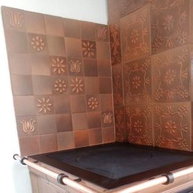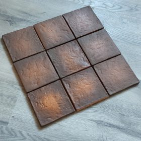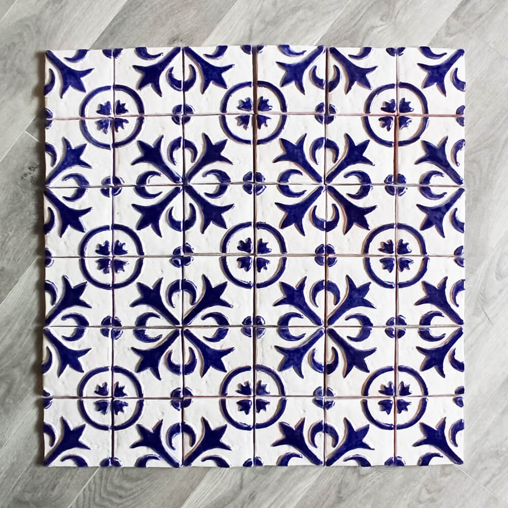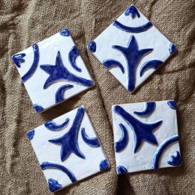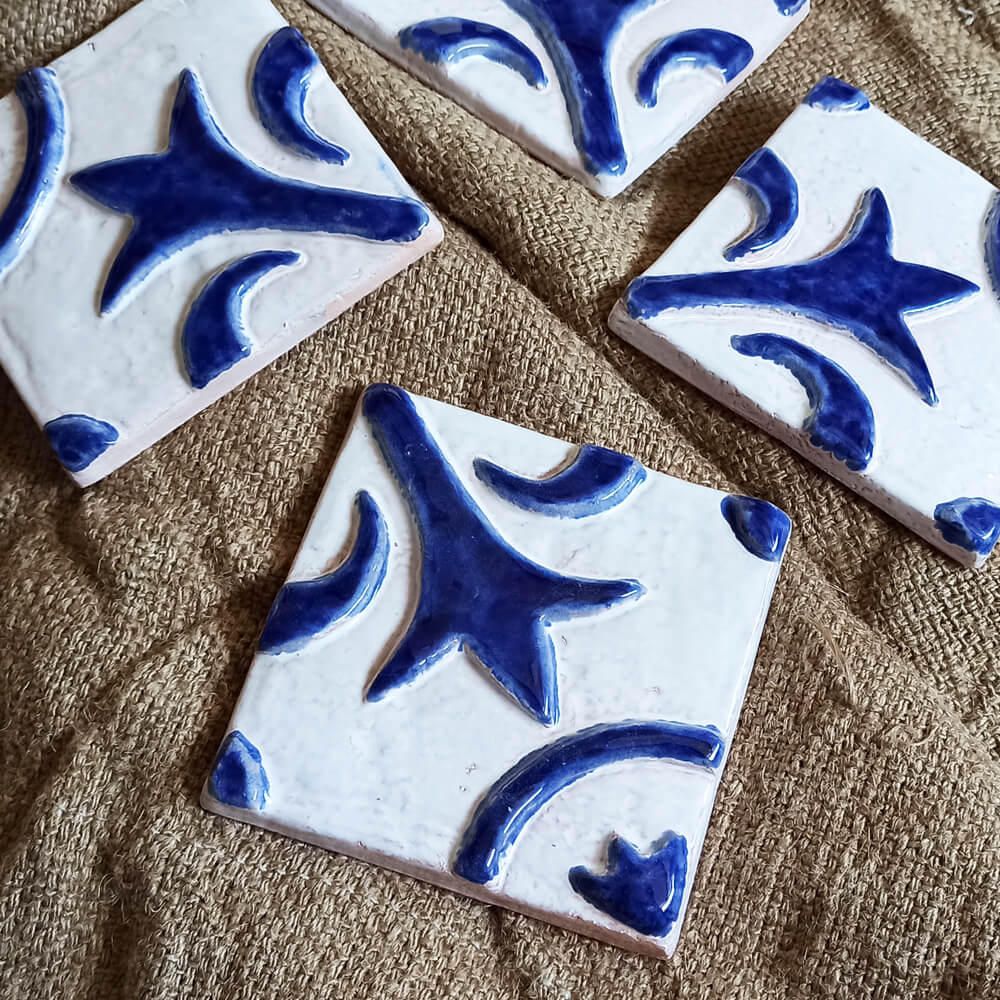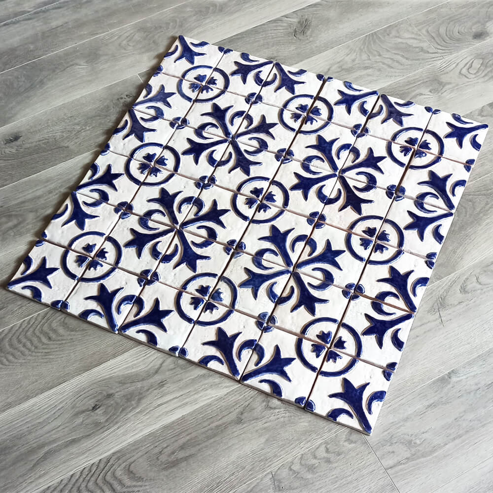 Faianță handmade, realizată prin presare manuală din argilă cu conținut de praf de șamotă. Aceste plăci sunt decorate cu model floral și geometric ieșit în relief. Modelul care iese în relief este pictat cu o culoare de accent. Cele mai des folosite culori în acest sens sunt culorile albastru, verde, maro, turcoaz, galben. Acest model este disponibil în 2 dimensiuni, 12,5 x 12,5 cm si 15 x 15 cm. Culorile se pot varia în funcție de designul interior al locuinței sau în funcție de preferințele personale.