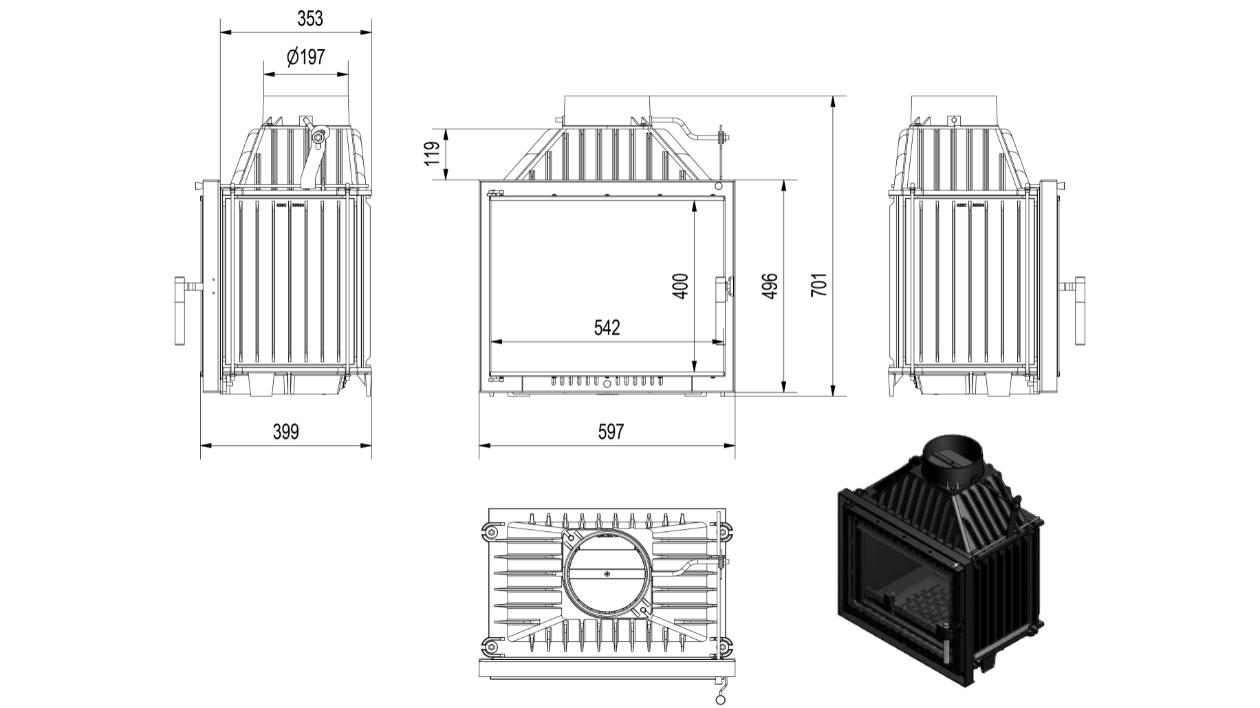 Focar de semineu N120 cu putere nominala 12 kw, randament 80%