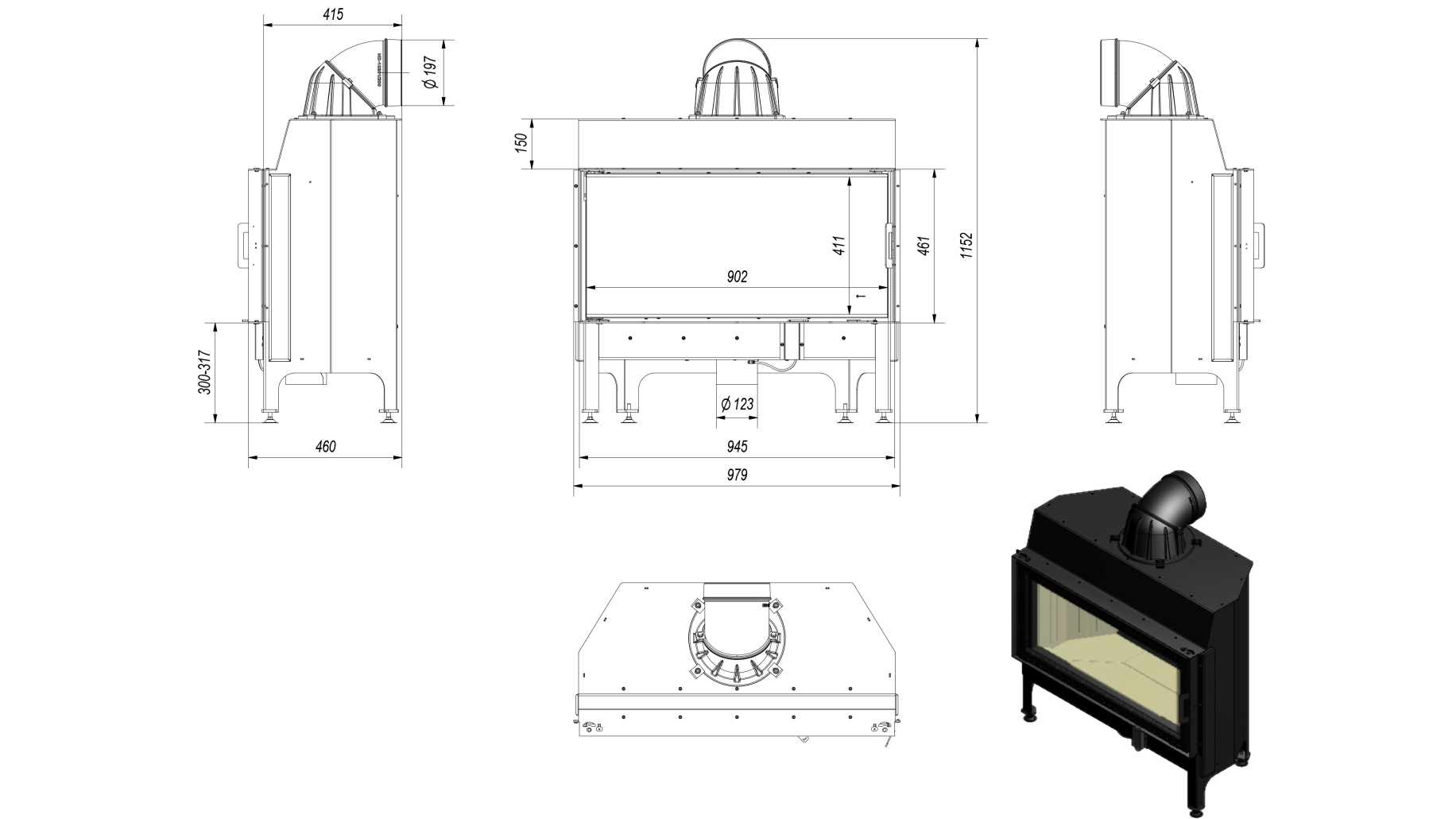 Focar de semineu N120 cu putere nominala 12 kw, randament 80%