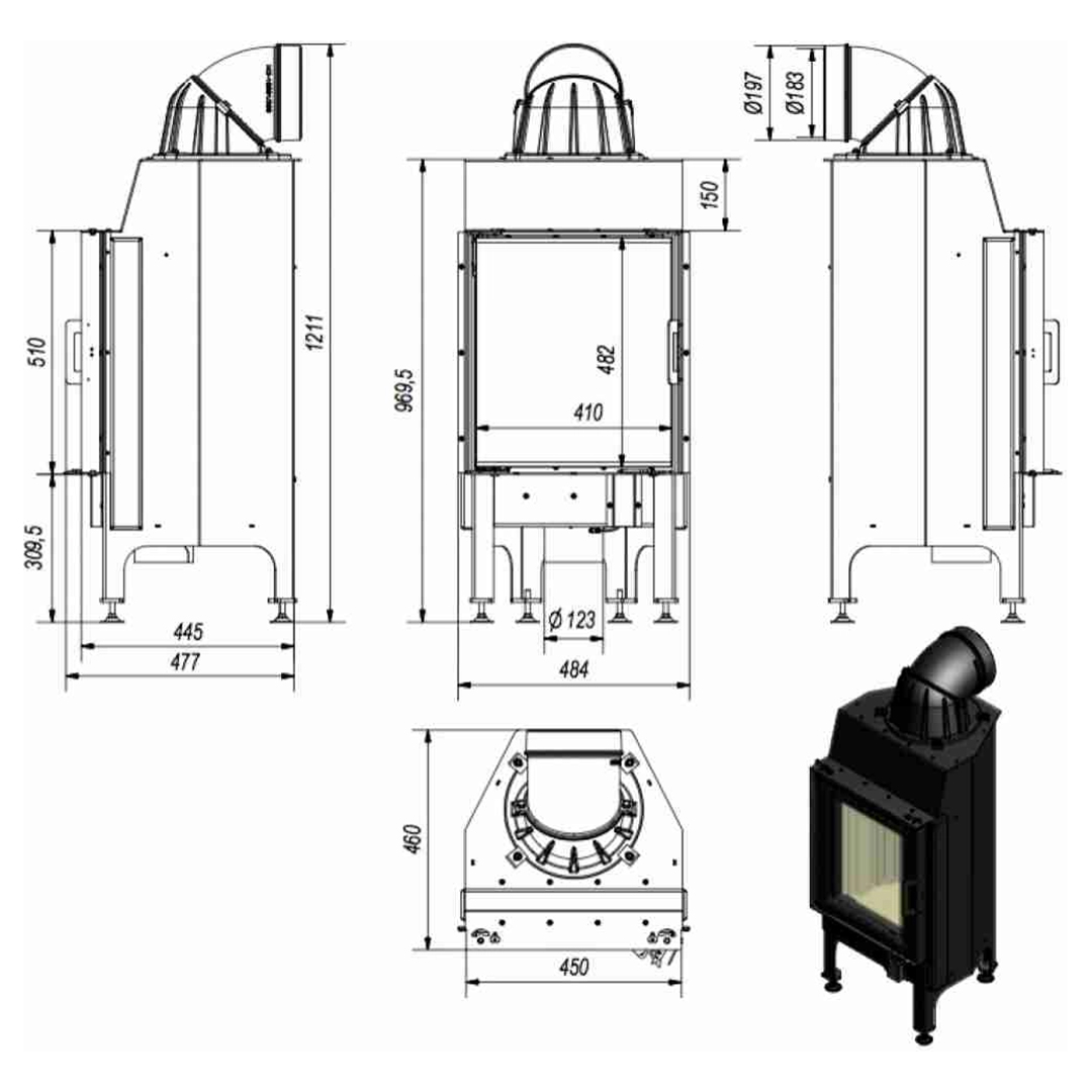 Focar cu design vertical, ideal pentru spatii de dimensiuni mai restranse. Focarul este echipat cu evacuare din fonta, ajustabila la 360 de grade. Acesta poate suporta de asemenea amplasarea unui recuperator din fonta, de greutate mai mare. Datorita arderii pe vatra si a formei hexagonale a acestuia, rezulta o ardere mai ampla si reziduri de cenusa scazute, prin urmare o camera de combustie mai curata. Focarul vine si cu posibilitatea de a schimba directia de deschidere a usii acestuia, pentru a beneficia de o deschidere confortabila indiferent de locul unde este amplasat.