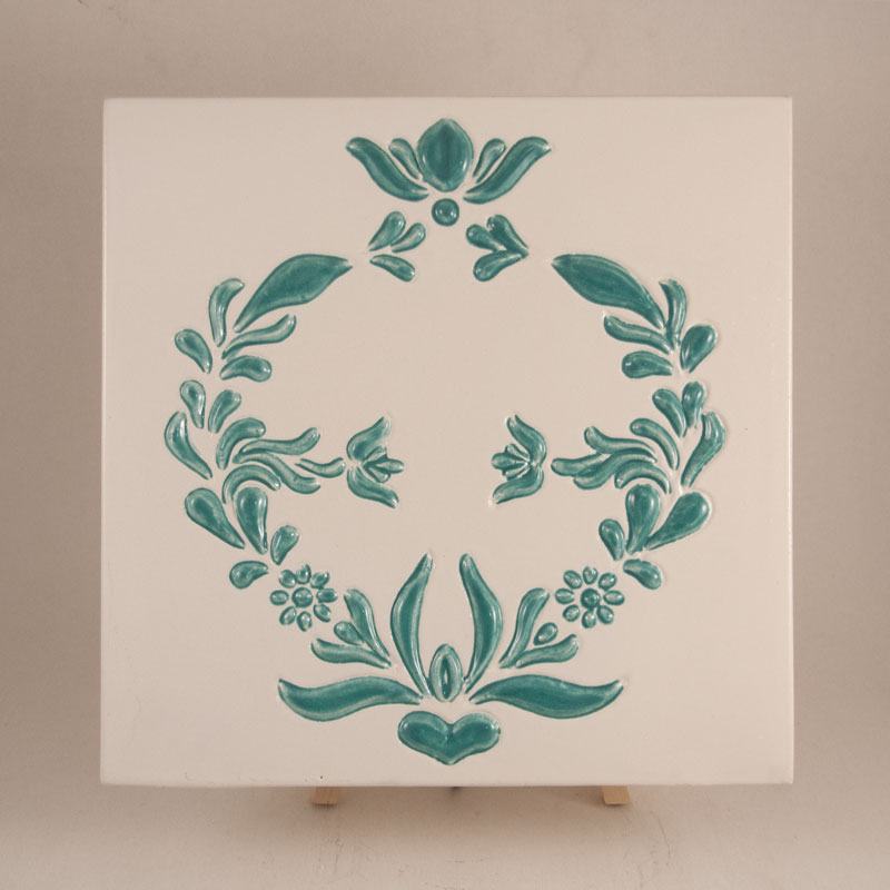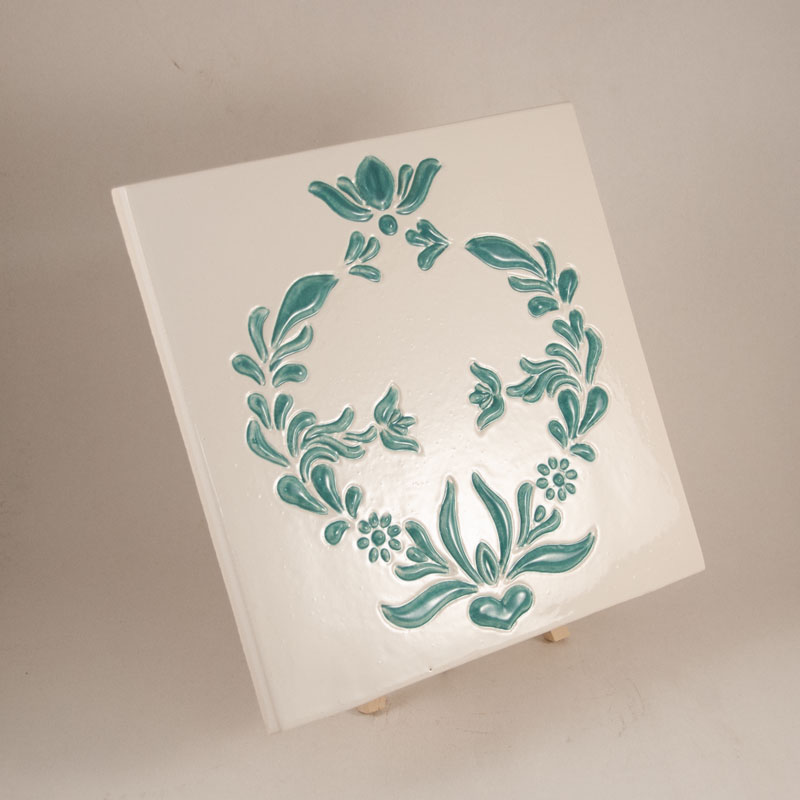 Cahla de teracota cu dimensiunile 23 x 23 cm, inspirata dintr-o placa de teracota apartinand unui centru de olarit din Targu Secuiesc, secolul al XIX-lea.