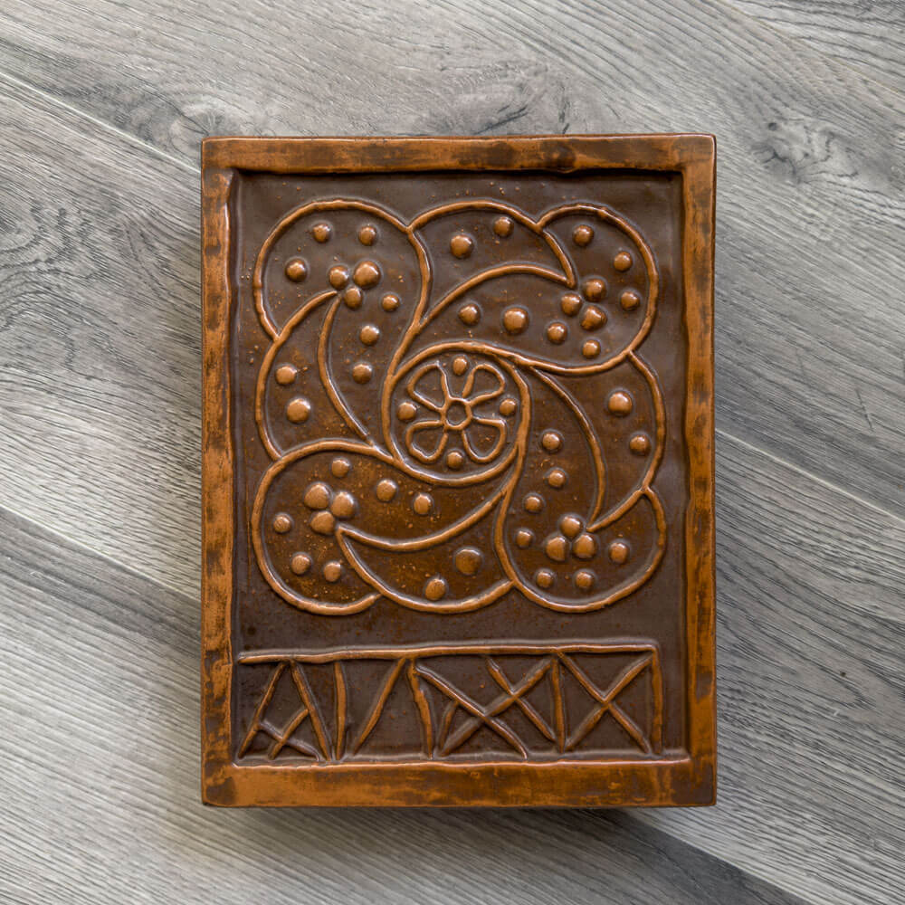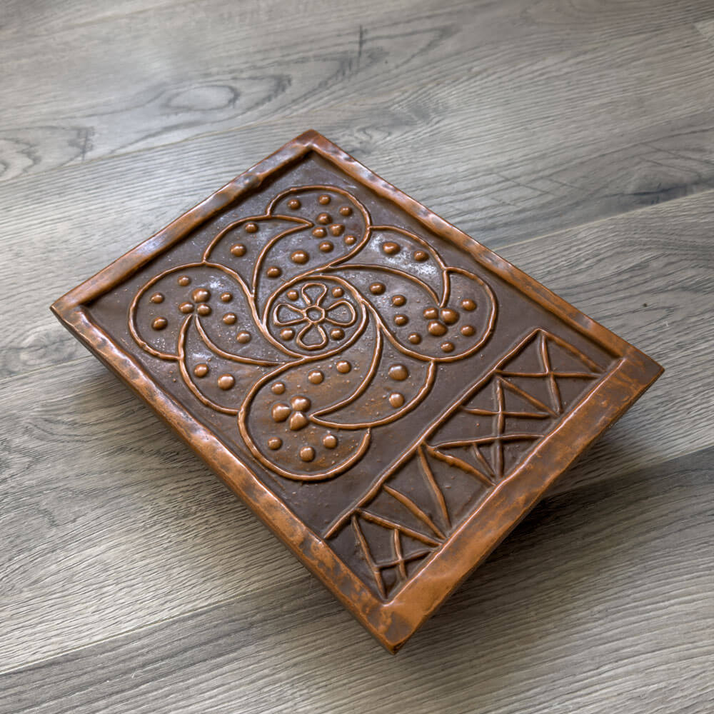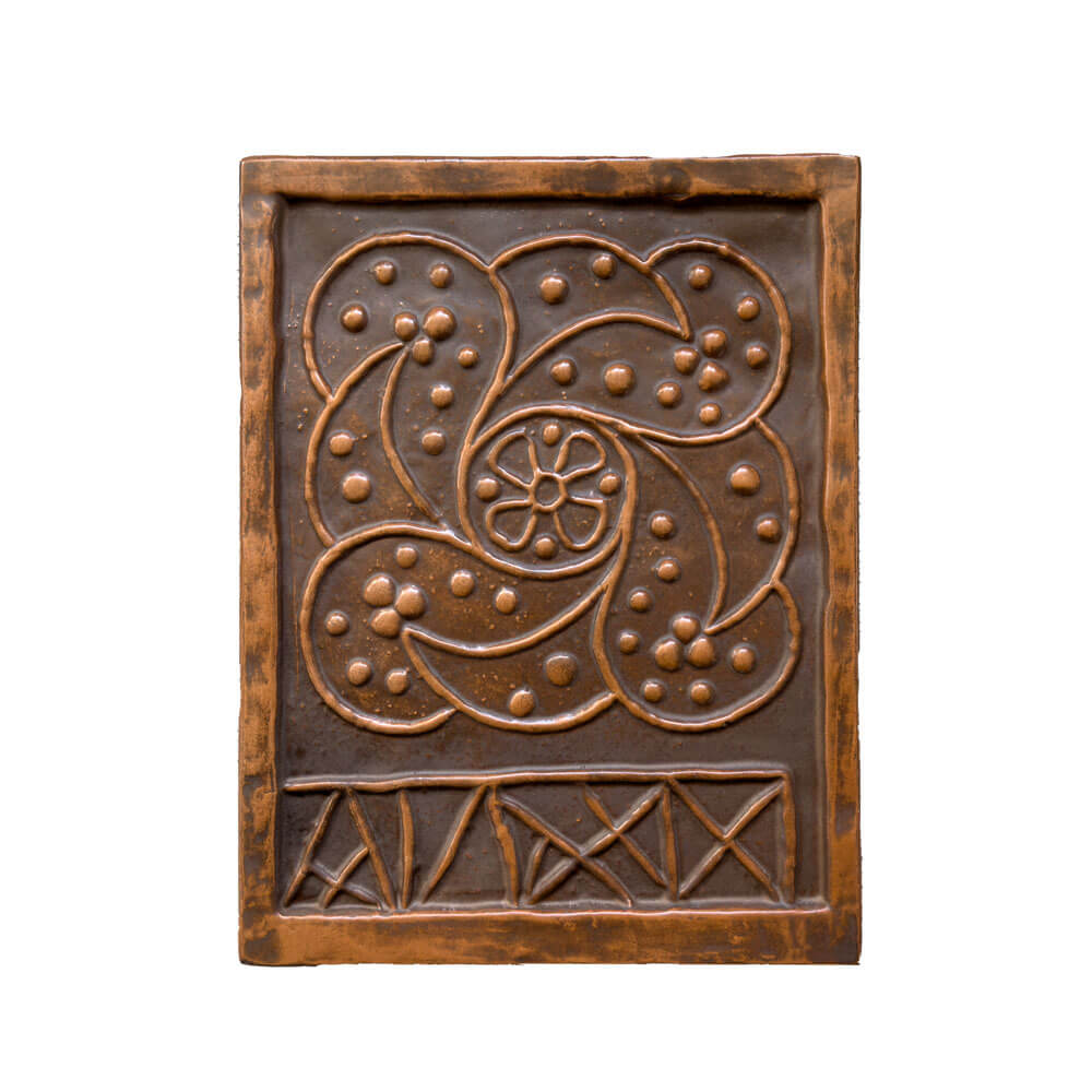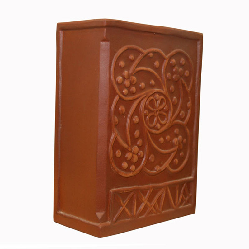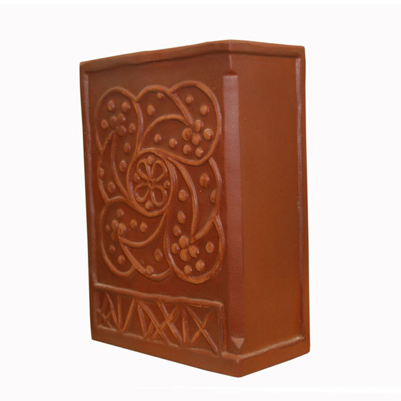 Cahla de teracota decorata cu model floral, realizata in stilul placilor din evul mediu, este decorata cu decor floral stilizat, in partea inferioara a placii intr-o caseta gasim un fel de inscriptie. O putem glazura intr-o multitudine de culori, pentru mai multe detalii despre gama de culori accesati acest link.