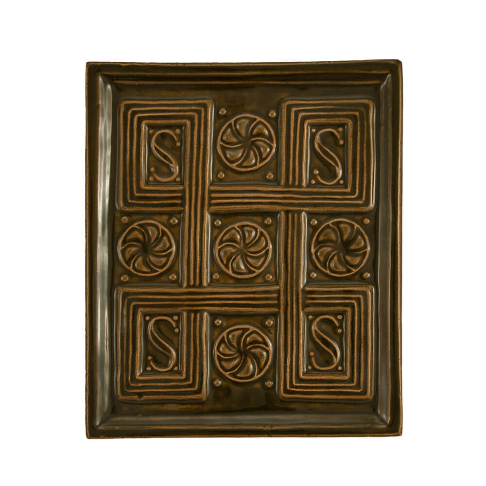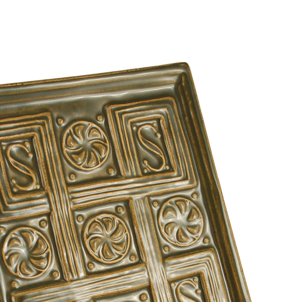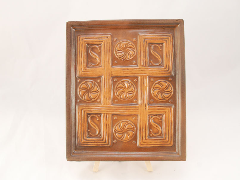 Cahla de soba dreptunghiulara, nesmaltuita, cu rame laterale. Decor in relief cu motive ornamentale geometrice, rosete si motive asemanatoare literei S. Secolul al XV – XVI – lea, Cristuru Secuiesc.