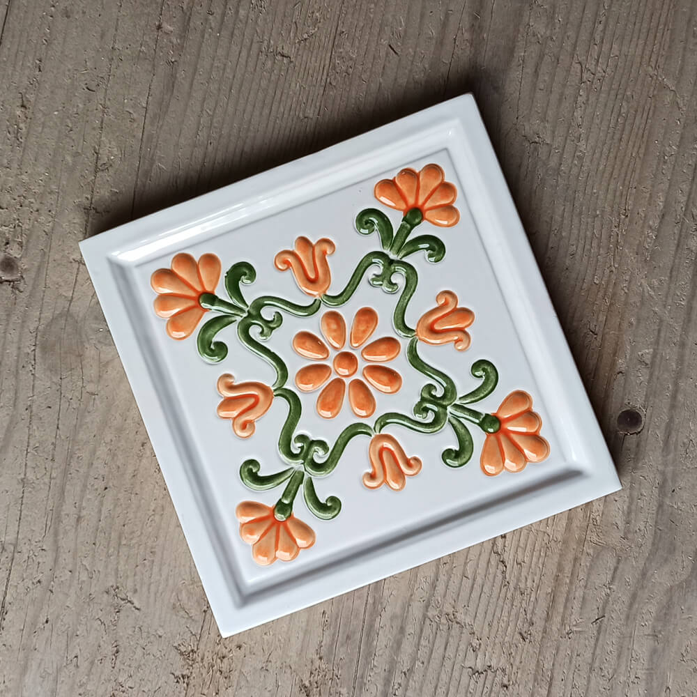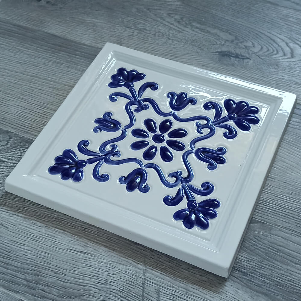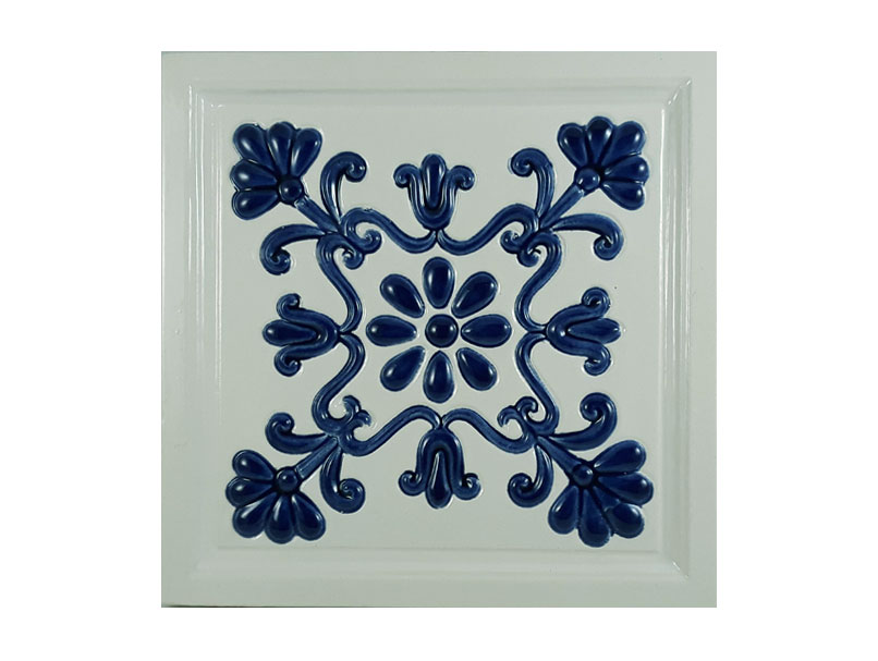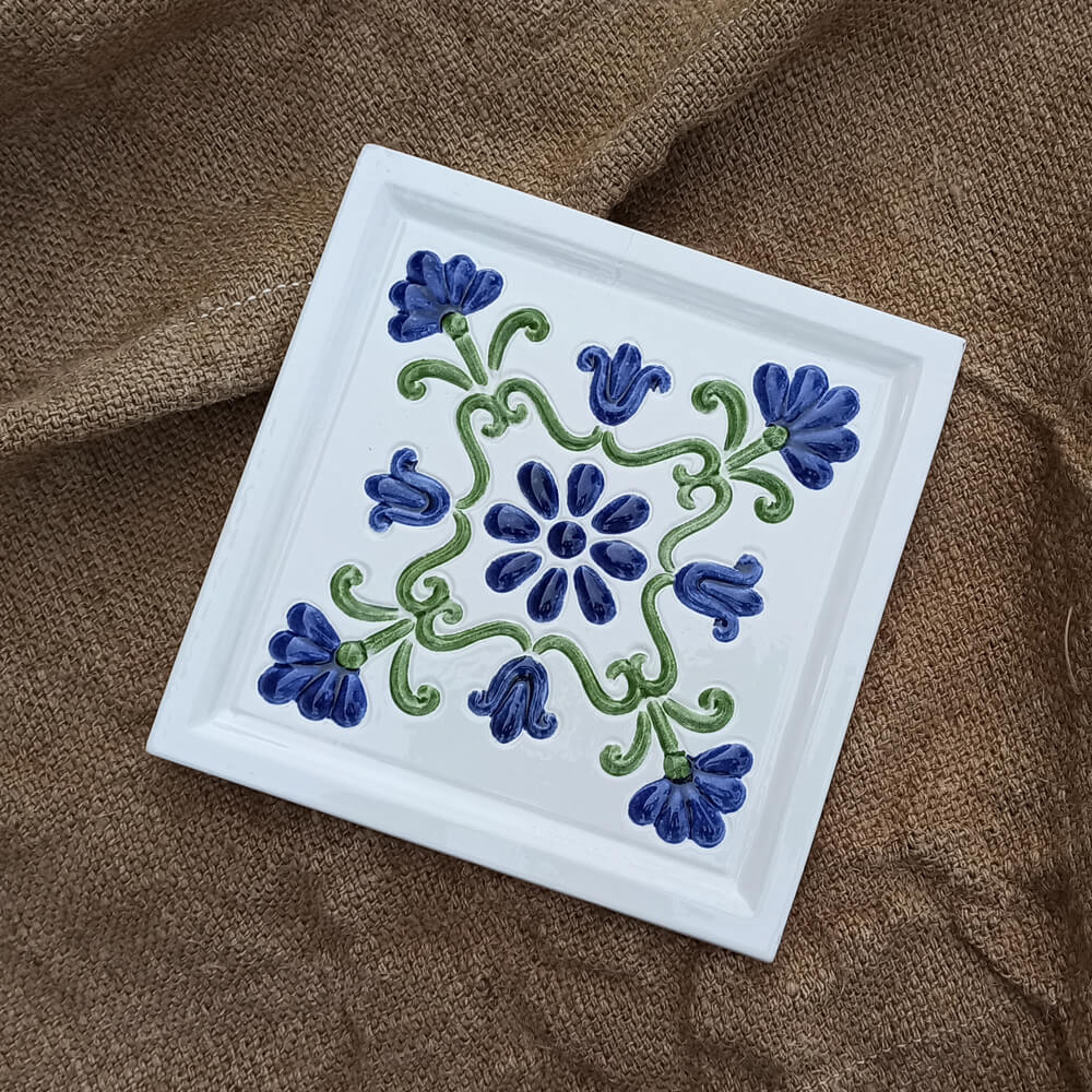 Cahla dreptunghiulara, decorata cu motive florale pictate cu albastru, apartinand zonei Bistrita.