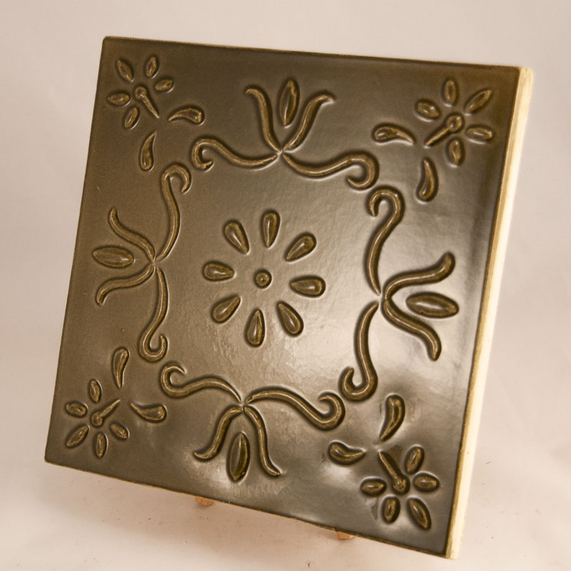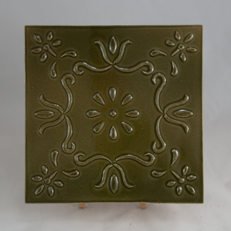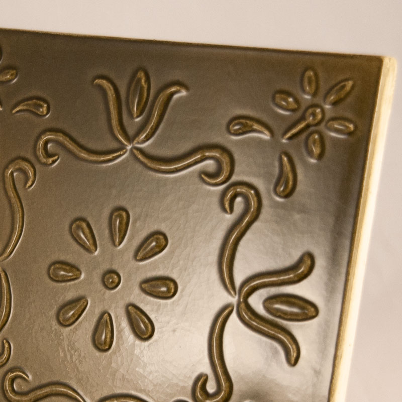 Placa de teracota realizata dupa un model floral, apartinand zonei Bistritei, din secolul al XIX-lea. Din acest model gasim si placi pictate manual, dar si placi glazurate cu glazura verde.
