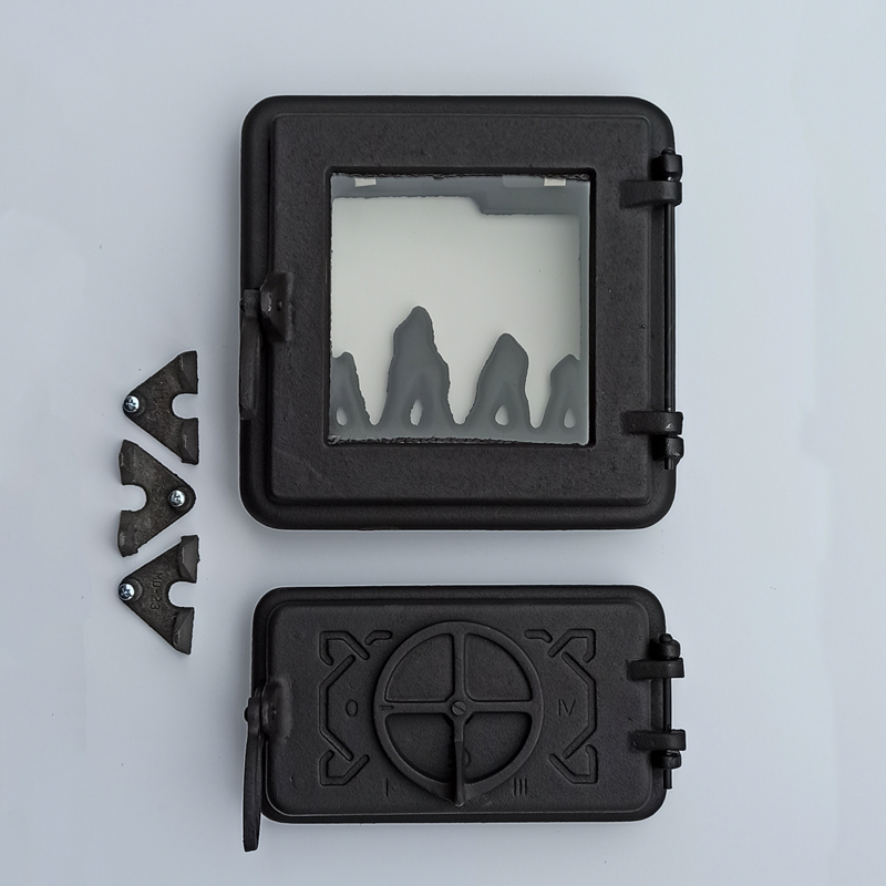 Set compus din usa de soba din fonta si cenusarul ei. Se preteaza la sobele de dimensiune mai mica, sau la sobele de gatit. Usa de alimentare precum si cea de cenusar sunt prevazute cu snur de etansare ecologic, astfel aceste usi au inchiderea etansa. Usa este prevazuta cu maner din fonta si 3 bucati de cleme pentru montaj care sunt tot din fonta si se fixeaza pe rama usii cu surub. La usa de cenusar montajul se realizeaza cu ajutorul benzilor metalice pe care le puteti vedea pe pozele alaturate.