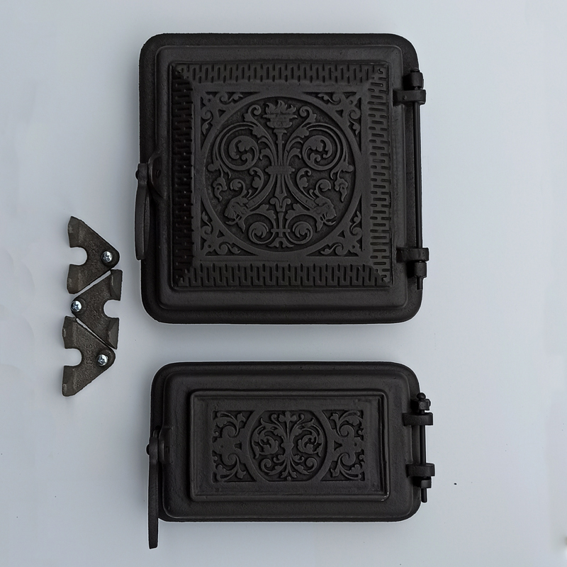 Set compus din usa de soba plina din fonta si cenusarul ei. Se preteaza la sobele de dimensiune mai mica, sau la sobele de gatit. Usa de alimentare precum si cea de cenusar sunt prevazute cu snur de etansare ecologic, astfel aceste usi au inchiderea etansa. Usa este prevazuta cu maner din fonta si 3 bucati de cleme pentru montaj care sunt tot din fonta si se fixeaza pe rama usii cu surub. La usa de cenusar montajul se realizeaza cu ajutorul benzilor metalice pe care le puteti vedea pe pozele alaturate.