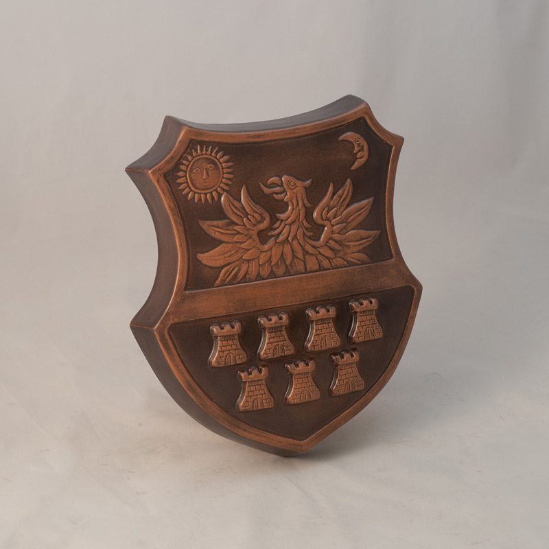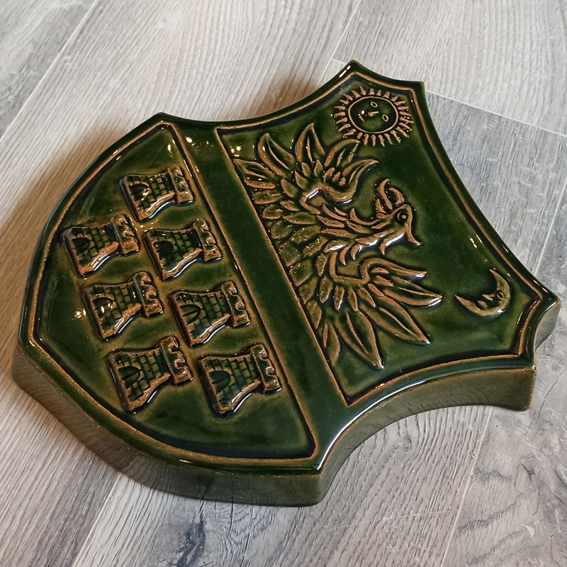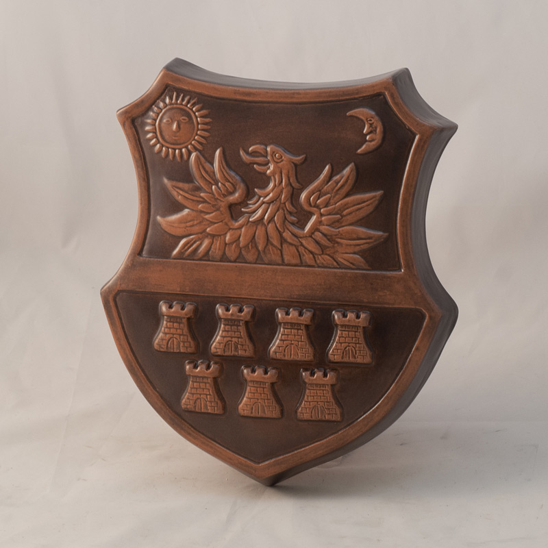 Stema transilvaniei, format mijlociu. Se poate glazura in mai multe culori, cel mai des realizat in culoarea verde olar si maro mat antichizat.