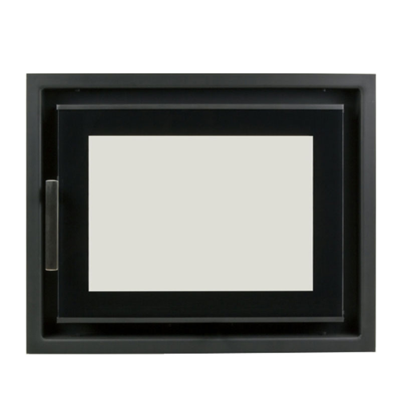 Usa de soba vitrata, prevazuta cu sticla dubla. In partea interioara aceste usi sunt realizate din fonta, exteriorul si rama de montaj reglabila in adancime sunt din otel. Este prevazut cu doua straturi de sticla termorezistenta fabricate in Germania, cea exterioara fiind tratata cu o vopsea termorezistenta speciala care ii confera eleganta. Toate partile metalice sunt tratate cu o vopsea termorezistenta neagra care confera un aspect atractiv pe termen lung acestei usi.