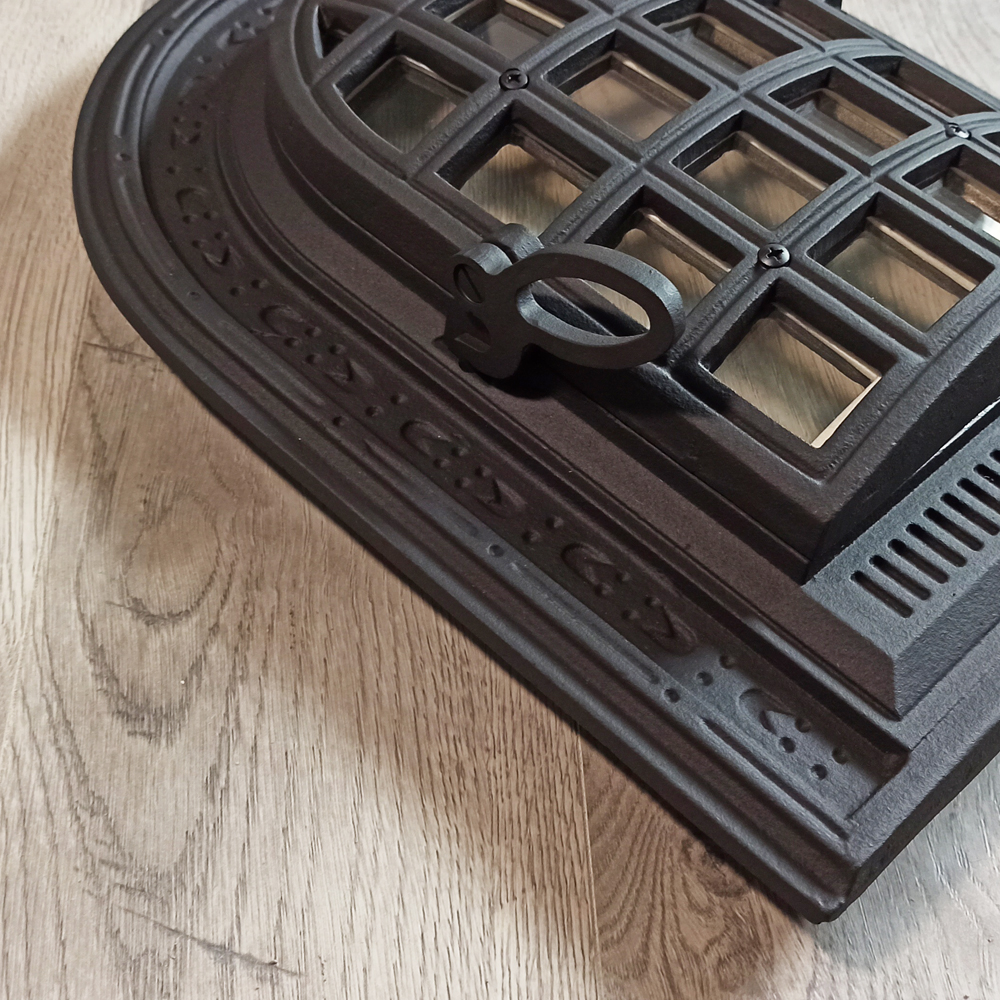 Usa de soba realizata in stil bogat ronamentat, care se potriveste la sobele de teracota realizate in stiluri arhitecturale variate. Usa este realizata din fonta de calitate superioara, prevazuta cu snur de etansare la inchidere si la sistemul de prindere al geamului.