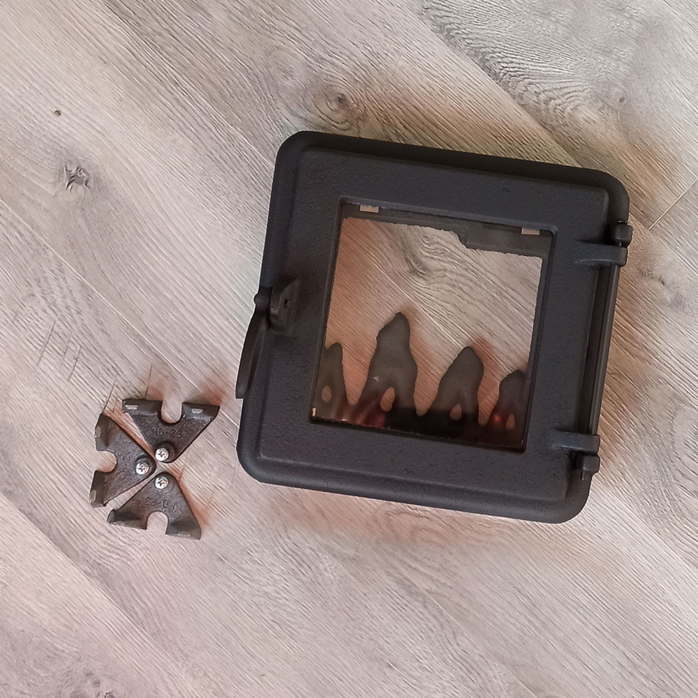 Usa de soba din fonta Neo. Se preteaza la sobele de dimensiune mai mica, sau la sobele de gatit. Aceasta usa de alimentare este prevazuta cu snur de etansare ecologic, astfel aceste usi au inchiderea etansa. Usa este prevazuta cu maner din fonta si 3 bucati de cleme pentru montaj care sunt tot din fonta si se fixeaza pe rama usii cu surub.