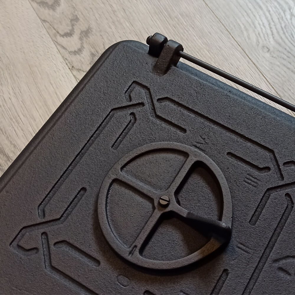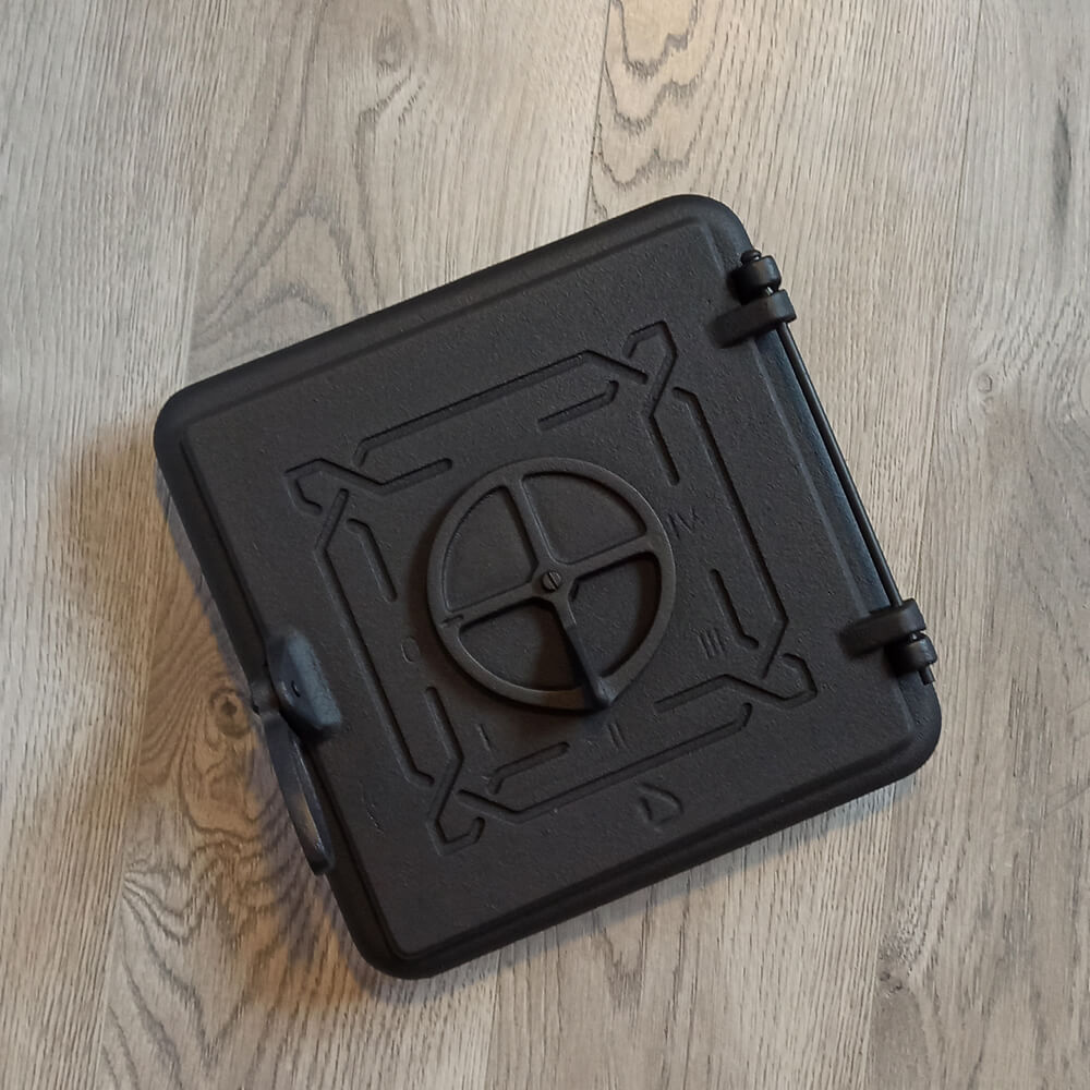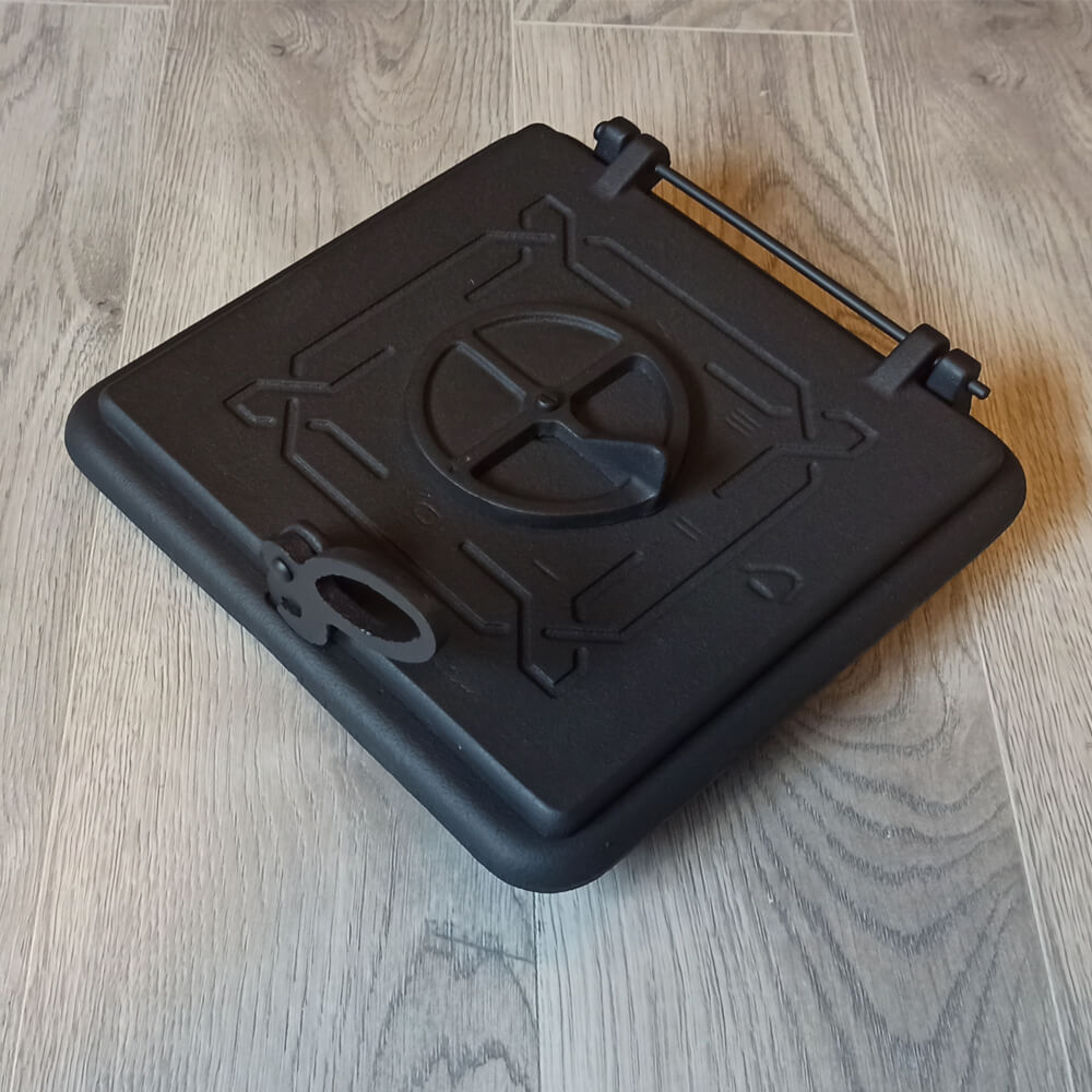 Usa soba din fonta plina, se preteaza la sobele de dimensiune mai mica, sau la sobele de gatit. Usa este prevazuta cu snur de etansare ecologic, astfel aceste usi au inchiderea etansa. Usa este prevazuta cu maner din fonta si 3 bucati de cleme pentru montaj care sunt tot din fonta si se fixeaza pe rama usii cu surub. Usa de soba este prevazuta cu o fanta de alimentare cu aerul necesar arderii, astfel soba se poate folosi si fara usa de cenusar, avand vatra opaca.