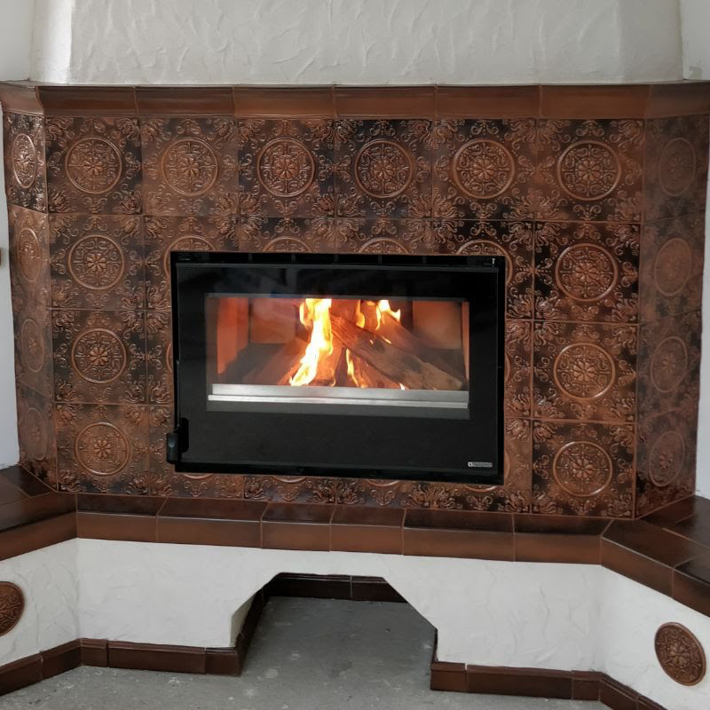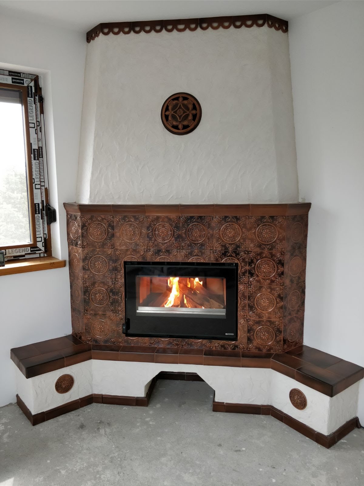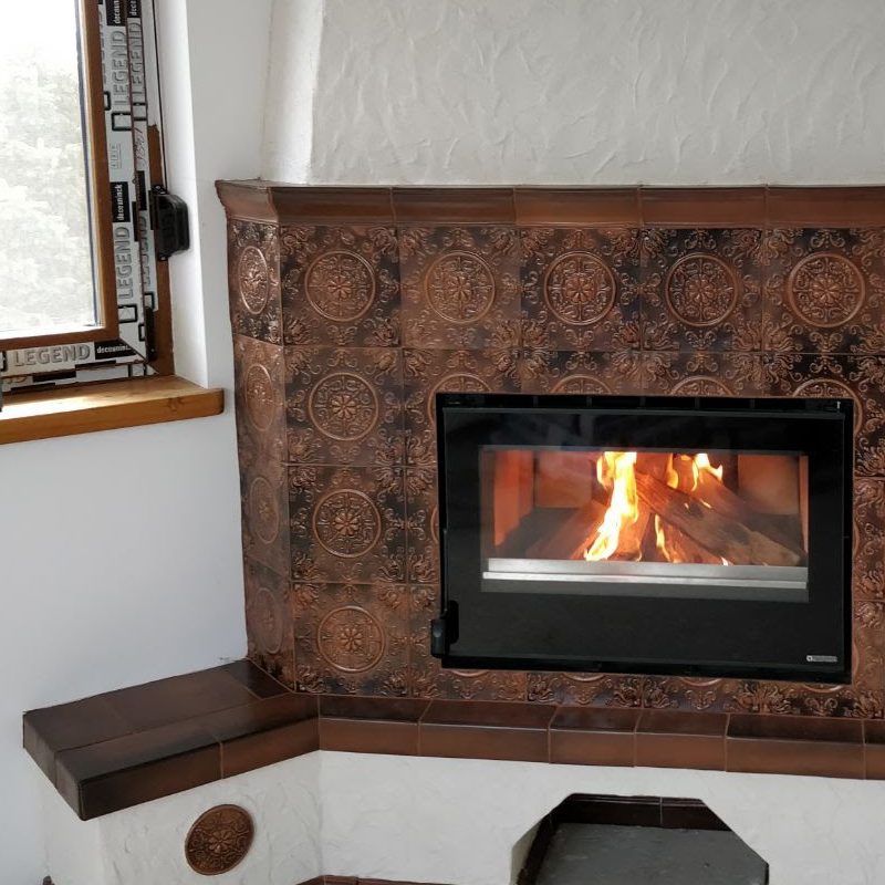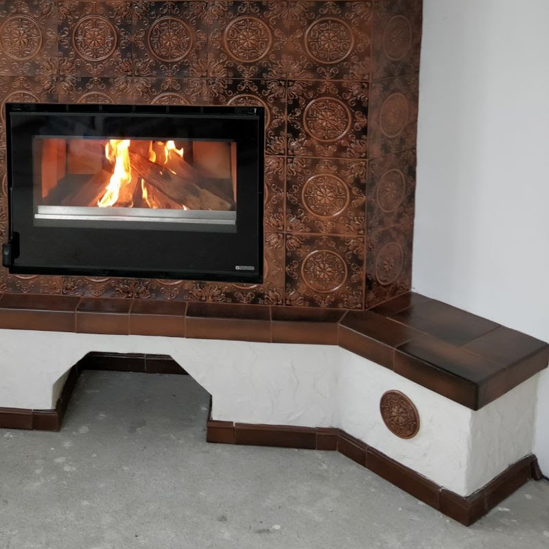Semineu cu focar, construita din placile de teracota T020, glazurate in culoare maro, samimat. Aceste placi s-a fabricat prin presare manuala in matrite din gips. Semineul s-a realizat in jurul unui focar Inserto 80 Crystal Ventilato, produs de catre La Nordica-Extraflame, producator de renume din Italia.