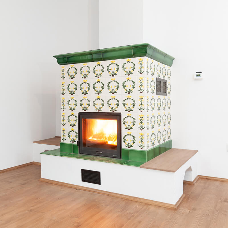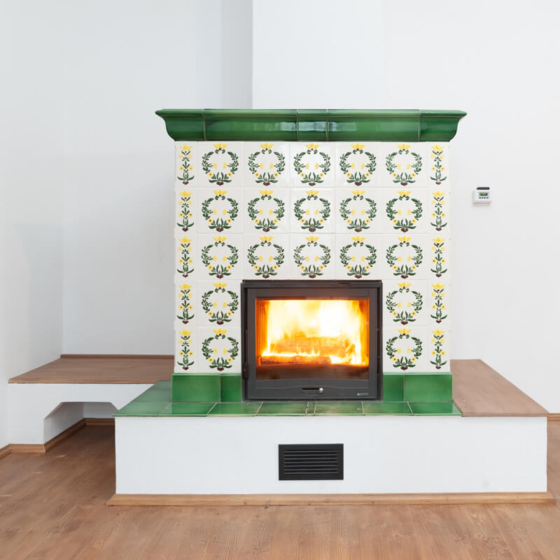 Semineu ceramic elegant, construit din placile de teracota T031, pictate manual cu culorile verde intens, galben si maro pe un fond alb. Aceste placi s-au fabricat prin turnare in matrite din gips, iar cornisele (brau) s-au realizat prin presare manuala. Semineul s-a realizat in jurul unui focar LaNordica-Extraflame, produs in Italia. Focarul de semineu a fost livrat cu urmatoarele accesorii optionale: camasa de captare a aerului cald, pentru a capta caldura produsa si pentru a o valorifica la incalzirea a inca 3 incaperi in afara de cel in care s-a amplasat semineul, precum si un ventilator care permite incalzirea fortata a incaperilor existenti in casa.