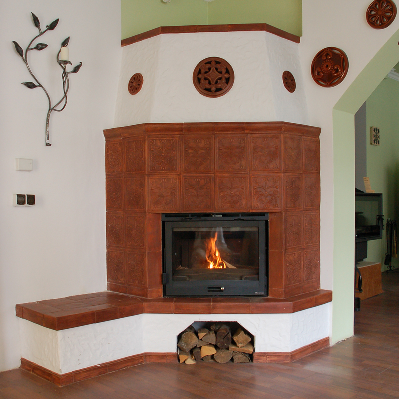 Seminue rustic, construit din placile de teracota T005, glazurate in culoare maro, semimat. Aceste placi s-au fabricat prin presare manuala in matrite din gips. Semineul s-a realizat in jurul unui focar Inserto 70 Ventilato, produs de La Nordica-Extraflame, un producator de focare de semineu din Italia.