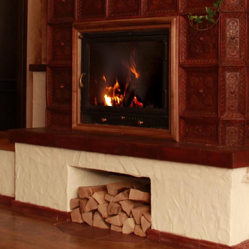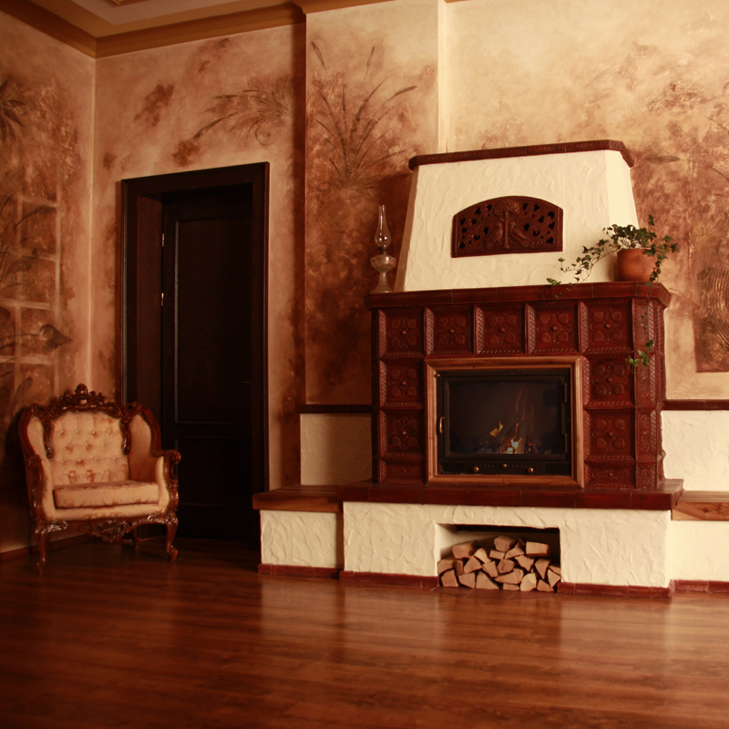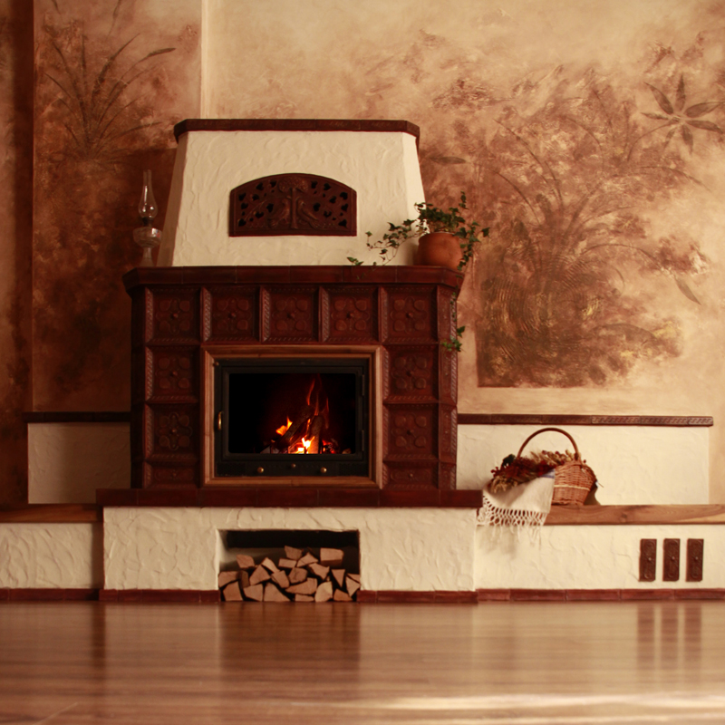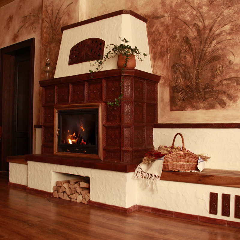 Semineu rustic, construit din placile de teracota T007, glazurate in culoare maro, semimat. Aceste placi s-au fabricat prin presare manuala in matrite din gips. Semineul s-a realizat in jurul unui focar Pilis, produs de catre firma Benkel, un producator de focare de semineu din Ungaria.
