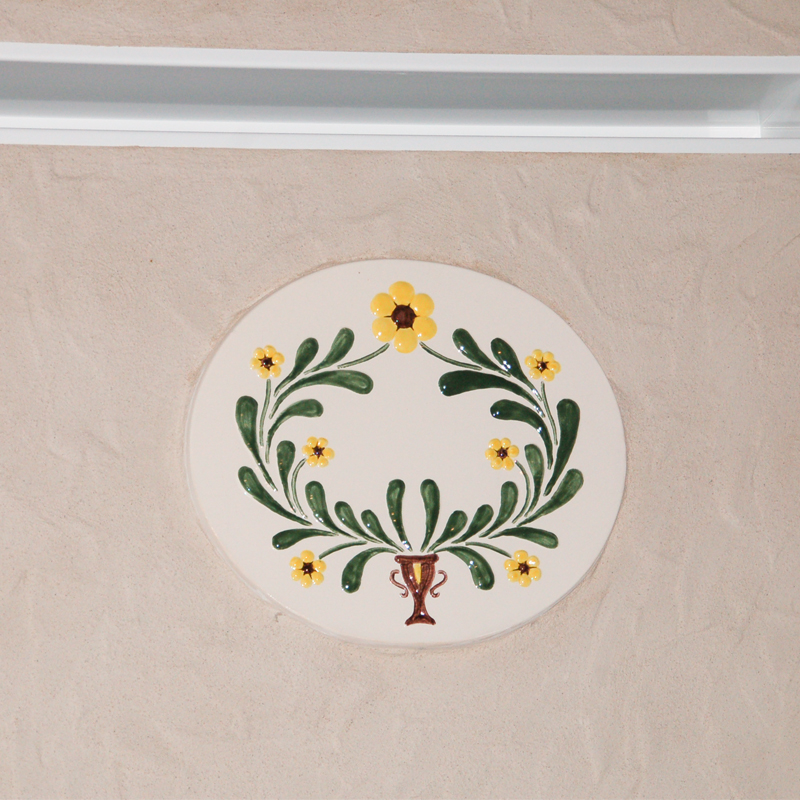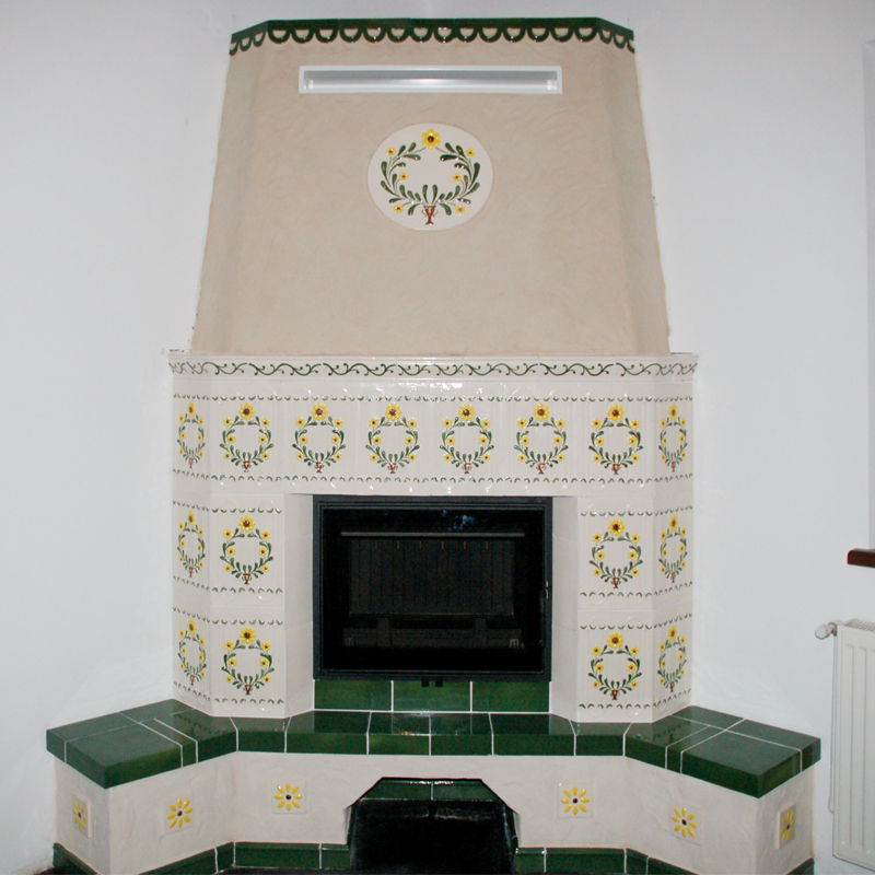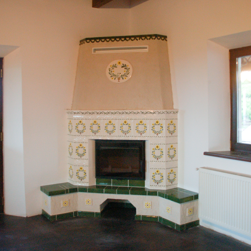 Semineu colt din teracota construit din placile de teracota pictate manual T026, folosind un focar de termosemineu Inserto 70 Ventilato, produs de LaNordica, un fabricant de prestigiu din Italia. Cu acest focar de semineu este incalzita o sala de dimensiune mare, construita pentru degustare vinuri. Semineul este construit in coltul camerei, langa peretii exteriori al salii, dar fiind un focar cu perete dublu si avand mai multe iesiri pentru aerul cald, acest focar ar fi capabil sa incalzeasca inca o camera. Semineul este racordat la un cos de fum construit in exteriorul cladirii.