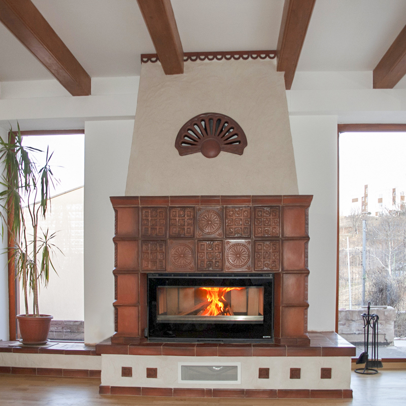 Semineu de teracota, construit din placile de teracota T016, glazurate in culoare maro, semimat. Aceste placi s-au fabricat prin presare manuala in matrite din gips. Semineul s-a realizat in jurul unui focar Inserto 100 Wide, produs de catre La Nordica-Extraflame, producator de renume din Italia.