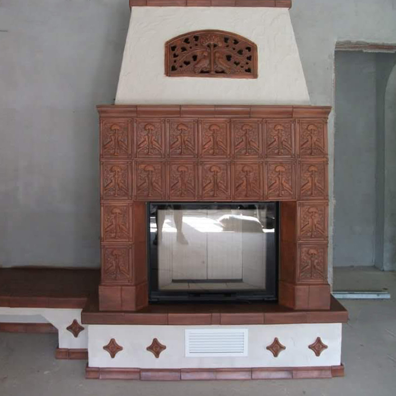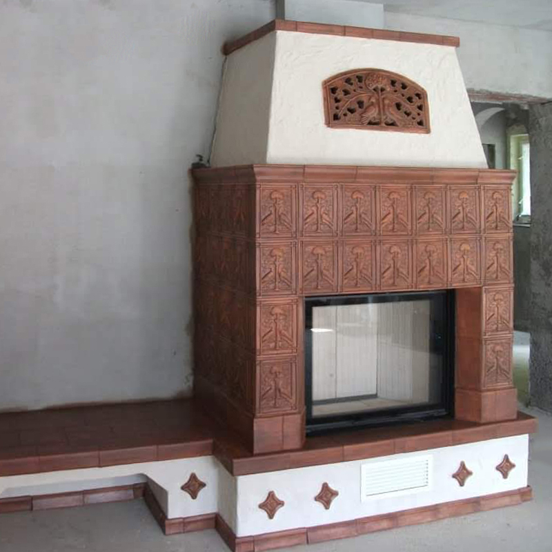 Semineu rustic, construit din placile de teracota T010, glazurate in culoare maro, semimat. Aceste placi s-au fabricat prin presare manuala in matrite din gips. Semineul s-a realizat in jurul unui focar MBO150, produs de catre firma Kratki, un producator de focare de semineu din Polonia. Acest focar este un produs din gama premium a producatorului.