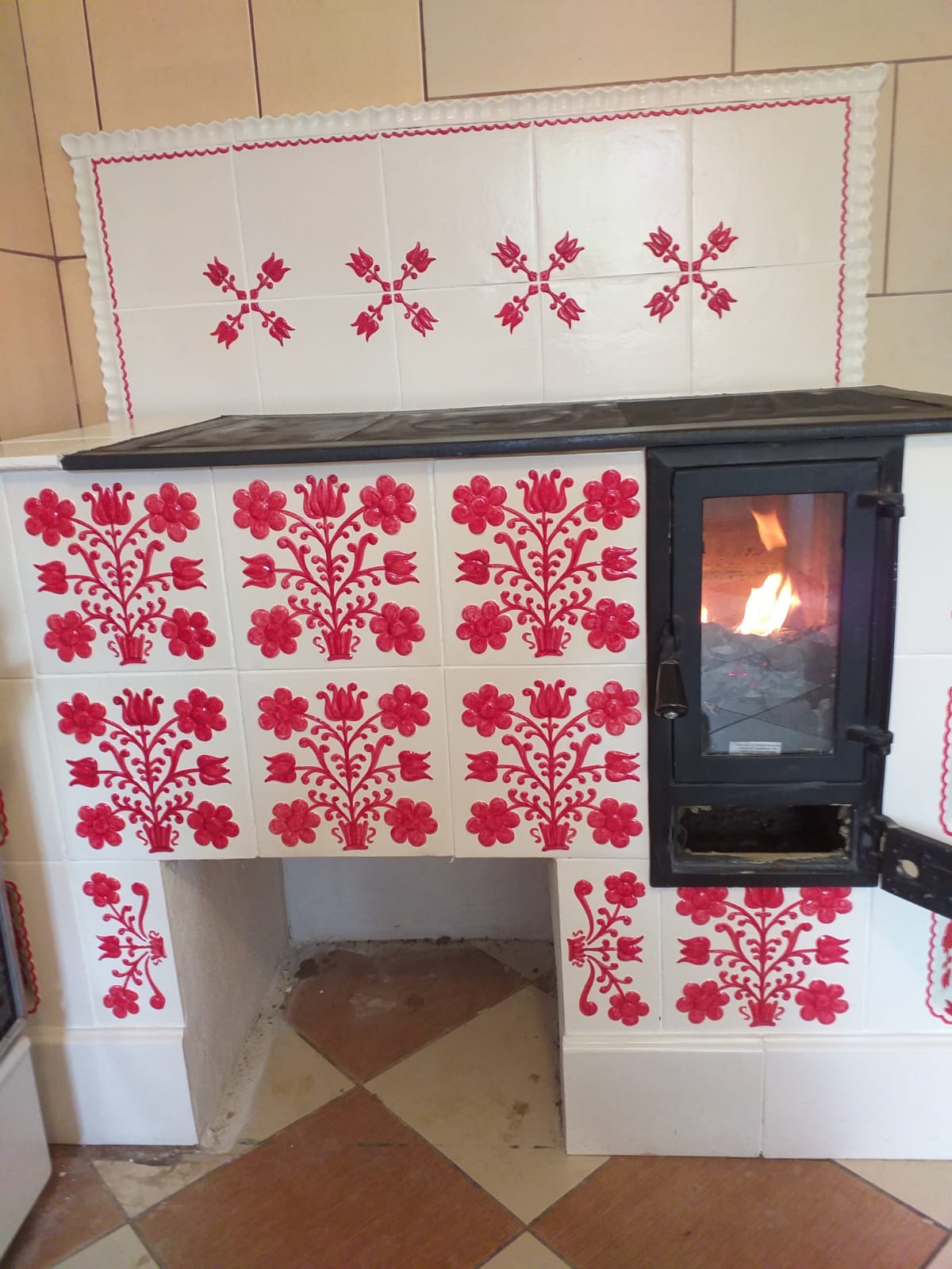 Pe peretele din spatele sobei de gatit, deasupra plitei am realizat si o placare din placi pictate manual, cu decor mai aerisit, realizat special pentru acest model de placa de teracota.