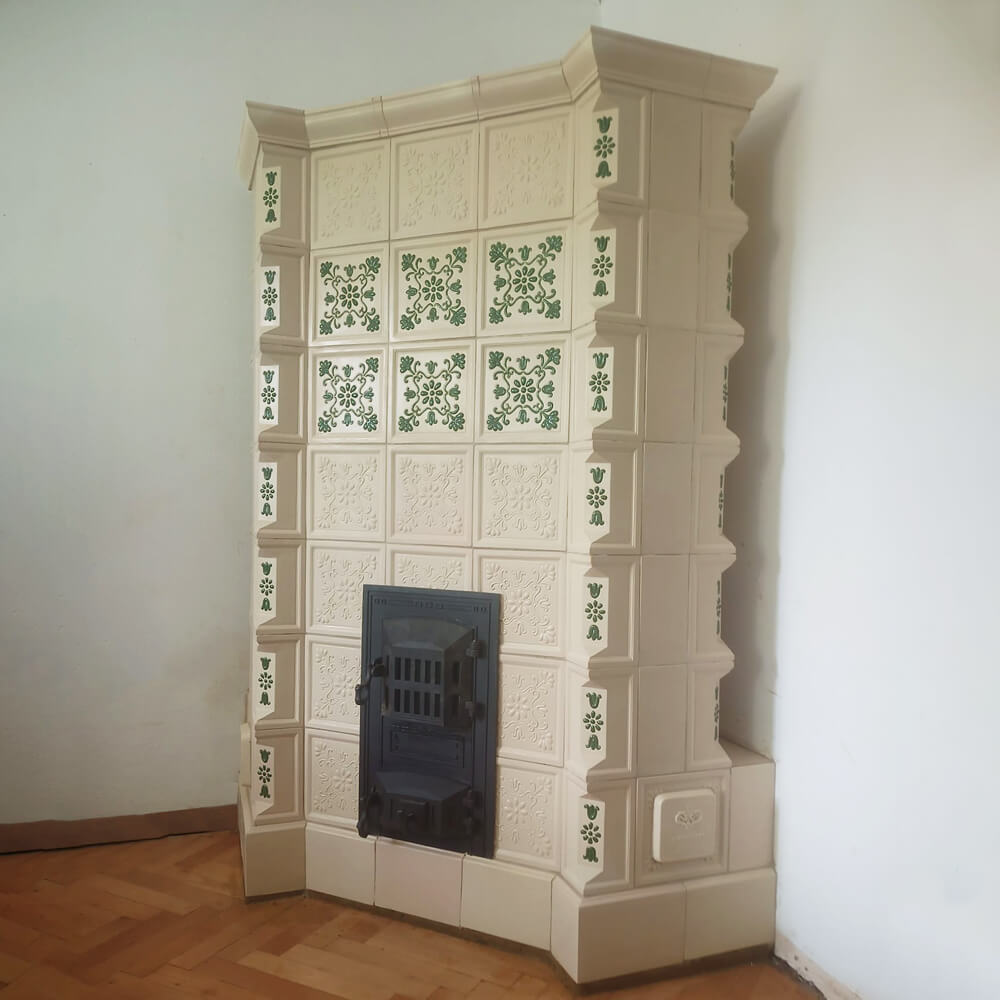 Soba de teracota Z009 are o forma clasica care creaza un contrast placut intre placile de teracota crem si suprafetele tencuite albe, astfel se potriveste excelent intr-un interior clasic sau rustic. Soba este realizata din placi de teracota culoare crem mat, dar avem si cateva placi de teracota, care s-au pictat manual, pentru un efect vizual mai puternic. Aceasta soba s-a construit in coltul camerei, neavand etajera la mijloc. Desi soba este construita in coltul camerei, ea nu s-a lipit de peretii din spate. Recomandam construirea sobei distantat de perete, pentru ca in acest caz mai primim o suprafata de degajare a caldurii (spatele sobei) si nu apar probleme cauzate de dilatarea sobei de teracota ca de exemplu crapaturi intre soba si perete sau chiar o distantare vizibila.