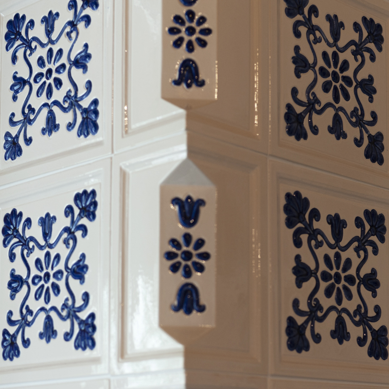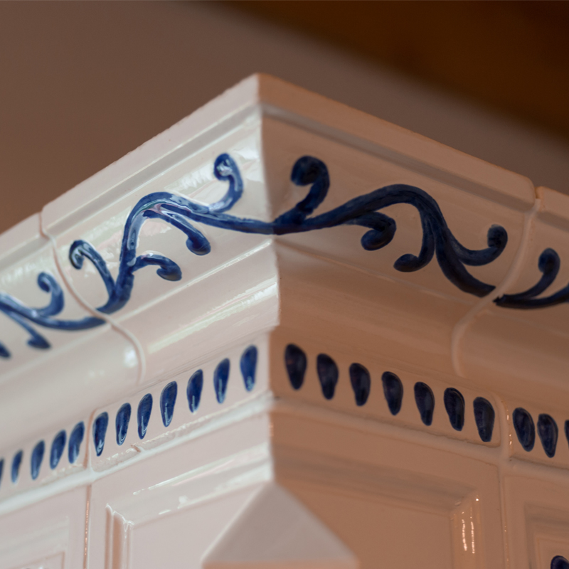 Partea superioara este realizata din placile de teracota T025 si cornise la fel pictate cu culoarea albastra. Aceasta soba este capabila de a incalzi o incapere de aproximativ 20-25 mp, dar dimensiunea sobei se poate adapta, recalcula pentru a corespunde spatiului pe care doriti sa o incalziti.