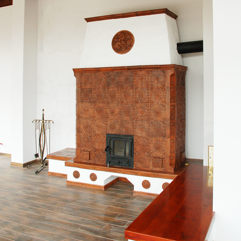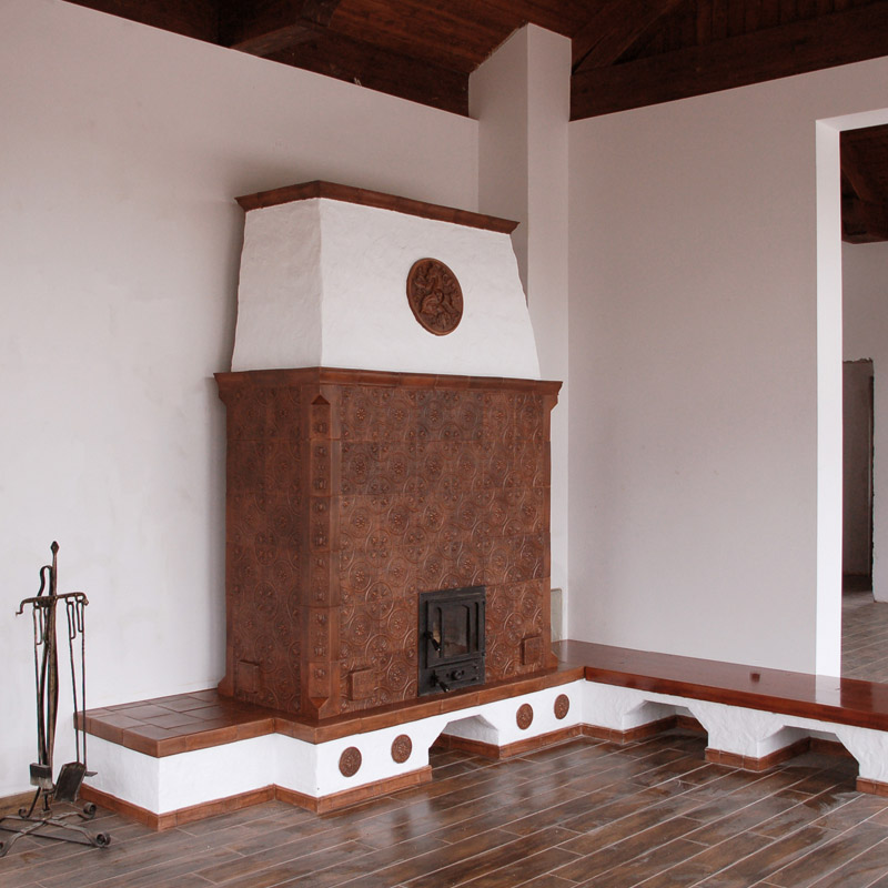 Soba de teracota Z049 are o forma tipica a semineelor de teracota, fiind prevazuta cu etajera de mijloc, nisa pentru pastrarea lemnelor precum si o usa cu sticla ca sa poti admira dansul flacarilor in soba. Soba insa nu este una obisnuita, avand dimensiuni atipice, fiind o soba imensa, care incalzeste o vila dintr-o zona restrasa din judetul Mures. Evident, si vila are niste dimensiuni foarte marei. Aceasta soba este realizata din placile de teracota T023, postamentul fiind realizat din zidarie si tencuit ulterior. Deasupra cornisei de mijloc avem o mica retragere, desaupra careia am realizat o suprafata tencuita in care s-a montat decorul central al sobei. Insa aceasta suprafata tencuita apartine de partea activa a sobei, fiindca s-a construit din placi de teracota tencuibile, astfel si ea degajeaza caldura produsa de soba.