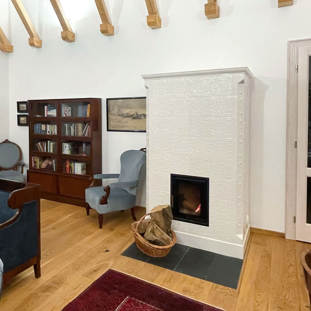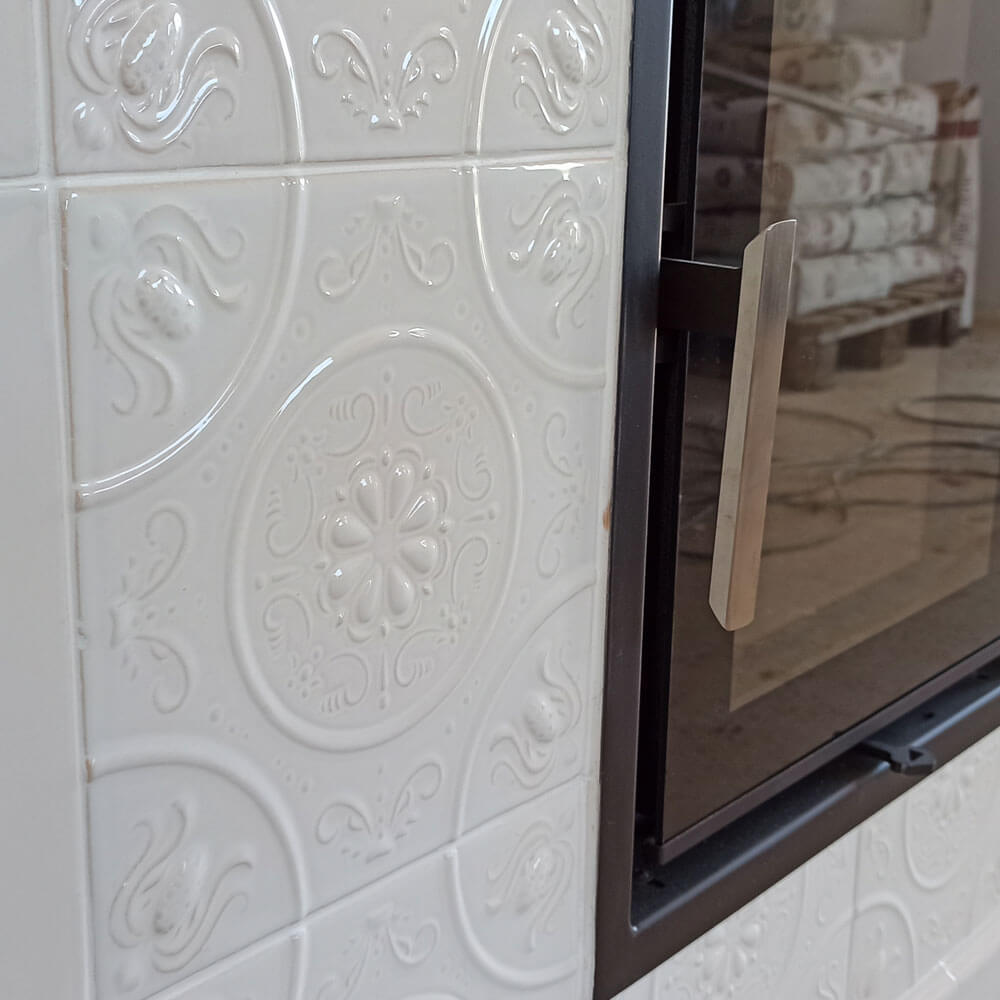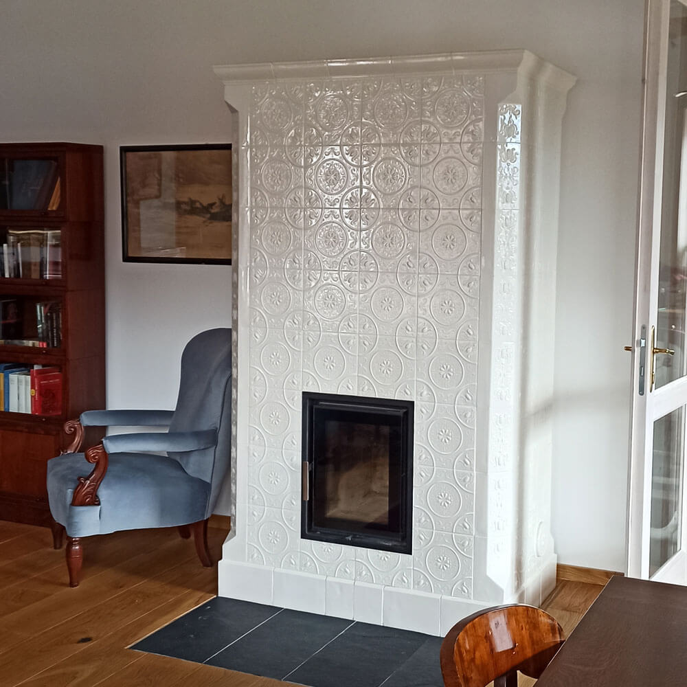 Aceasta soba de teracota a fost construit in sufrageria unei case nZEB, toate cladirea fiind foarte bine izolata. Din acest considerent, impreuna cu propietarul casei am optat pentru o soba de teracota de construtie grea, peretele exterior al sobei avand minim 10 cm, ceea ce permite o redare lenta a caldurii. Fiind o casa foarte bine izolata, exista pericolul supraincalzirii spatiului locuit. De aceea acest perete exterior mai gros in timp ce permite o acumulare foarte buna a caldurii, asigurand o temperatura mai mica pe suprafata sobei, care se valorifica intr-un timp mai indelungat. In faza proiectarii deja s-a prevazut realizarea canalului de aductiune de aer pentru ardere, folosind un tub cu sectiune circulara cu diametrul de 200 mm, usa speciala cu sticla dubla si admisie de aer exterior s-a racordat la acest canal. Aceasta usa permite o temperatura de ardere mai ridicata decat o usa de soba traditionala, astfel randament mai crescut si economie de combustibil. Soba este realizata din placile T039 decorate cu model floral. Aceasta soba este capabila de a incalzi o incapere mai mare, de aproximativ 25-30 mp, dar dimensiunea sobei se poate adapta, recalcula pentru a corespunde spatiului pe care doriti sa o incalziti.